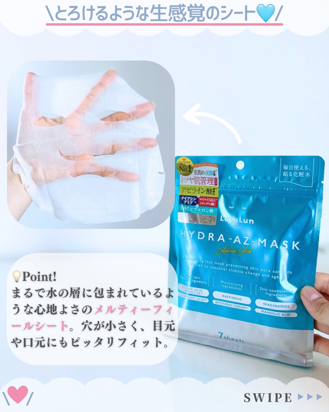 - 肌荒れ・皮脂ケア※1と健やかな肌の土台※2美容を叶える、アゼライン酸誘導体*1配合のうるおいツヤ肌管理マスクです。 肌荒れや肌の赤み、毛穴目立ちが気になる方に。 アゼライン酸*1×ナイアシンアミド*2+次世代ヒアルロン酸*3配合で、肌荒れをケアし、角質層をみずみずしいうるおいで満たします。 さらに肌表面でゆっくりと働くマイルドAHA*4が、古い角質をやわらげ、キメを整えることで、つるんとツヤめく素肌へ導きます。 シートはとろけるように肌に密着するメルティーフィールシートを採用。 シートが最も柔らかく感じられる液量を研究し、まるで水の層に包まれているような心地よさを実現しています。 (※1 ふき取りによる ※2 角質層のこと *1 肌荒れ防止成分 アゼロイルジグリシンK *2 整肌成分 *3 肌荒れ防止成分 加水分解ヒアルロン酸Na *4 整肌成分 マンデル酸)