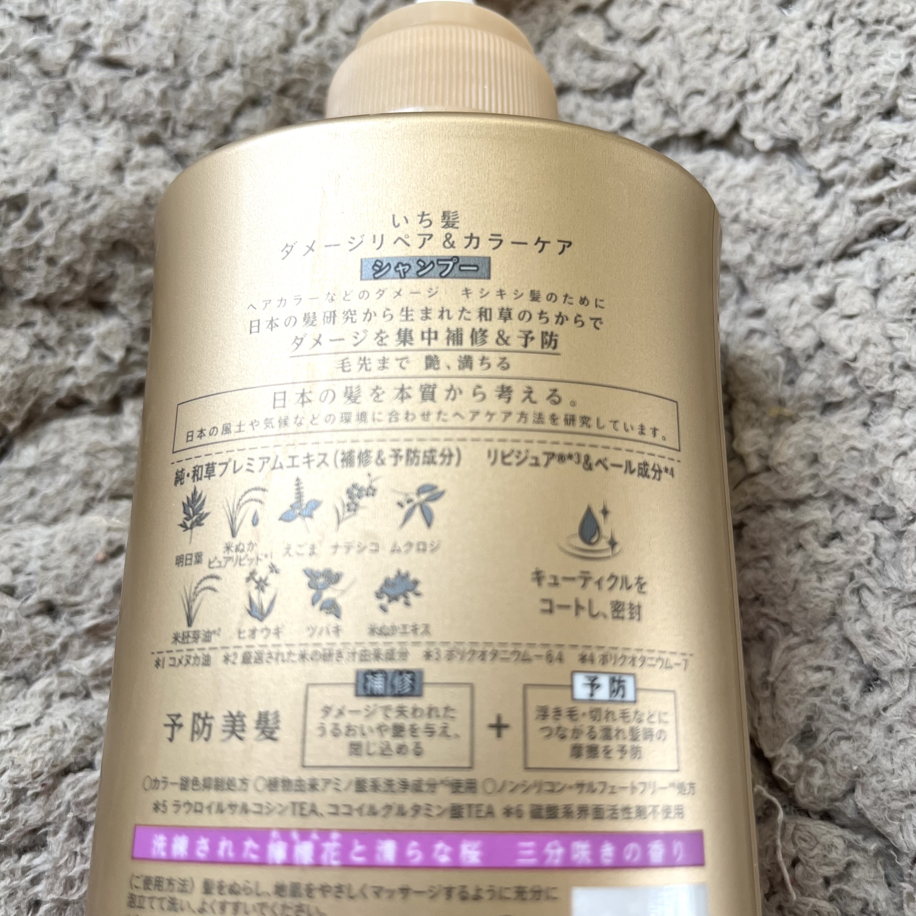 いち髪といえば、日本人、和!っというイメージがあるので、いち髪らしい和のテイストのかわいくて上品なパッケージだなと思いました☺️ ダメージリペア&カラーケアということで、ヘアカラーなどのダメージによるキシキシ髪で悩んでいる方におすすめとのこと。 においは洗練された檸檬花(れもんか)と清らな桜三分咲きの香り🌸