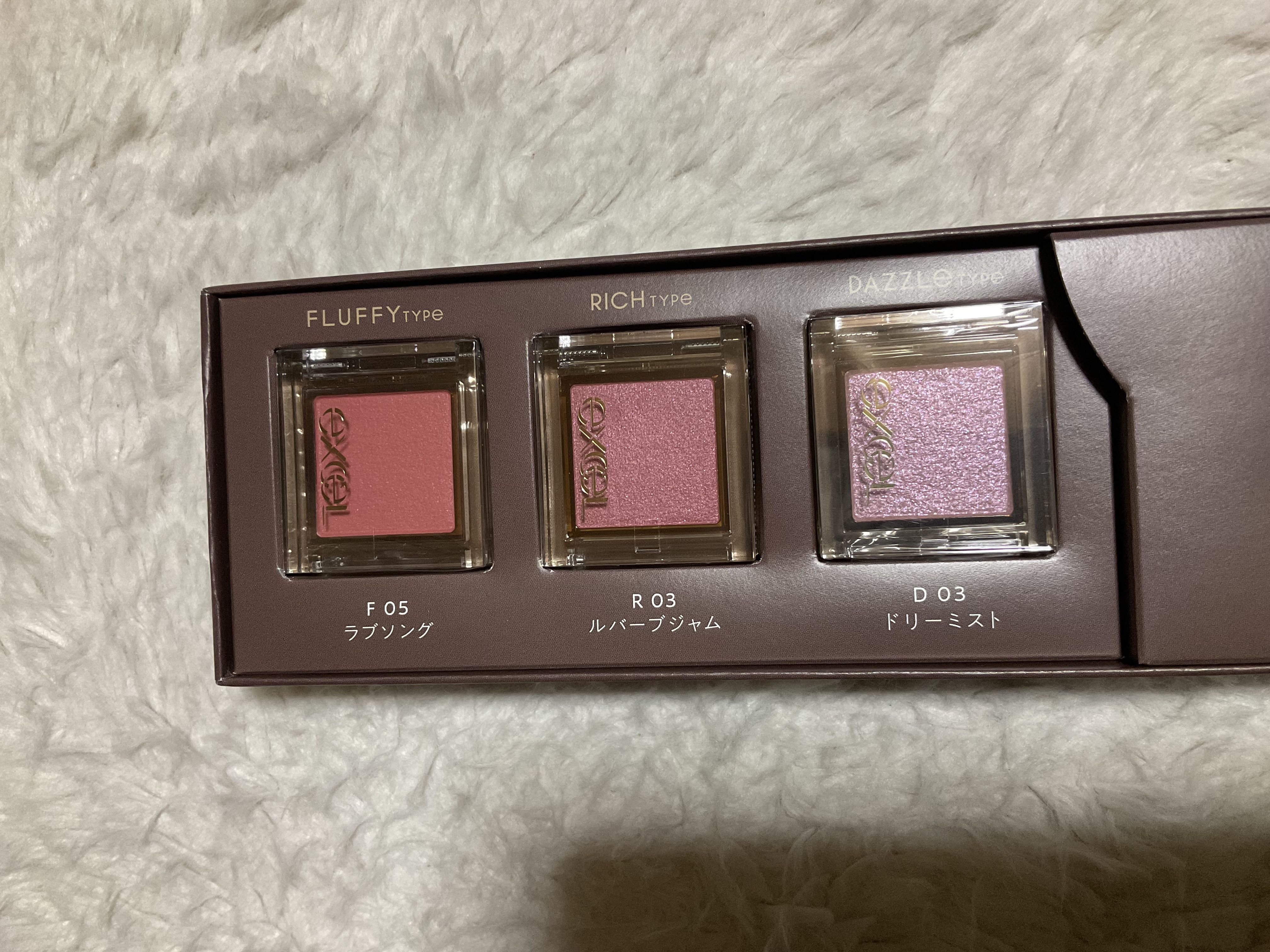 2個分の値段で3個着いてくるなんて見逃せませんでした。 艶感が超綺麗で甘くて情熱的な深みがでます。 F05はふんわりとした粉質で瞳に溶け込むセミマット R03はリッチな艶感で高級感があふれる D03は大粒の偏光入りパールで魅惑的に輝きます。