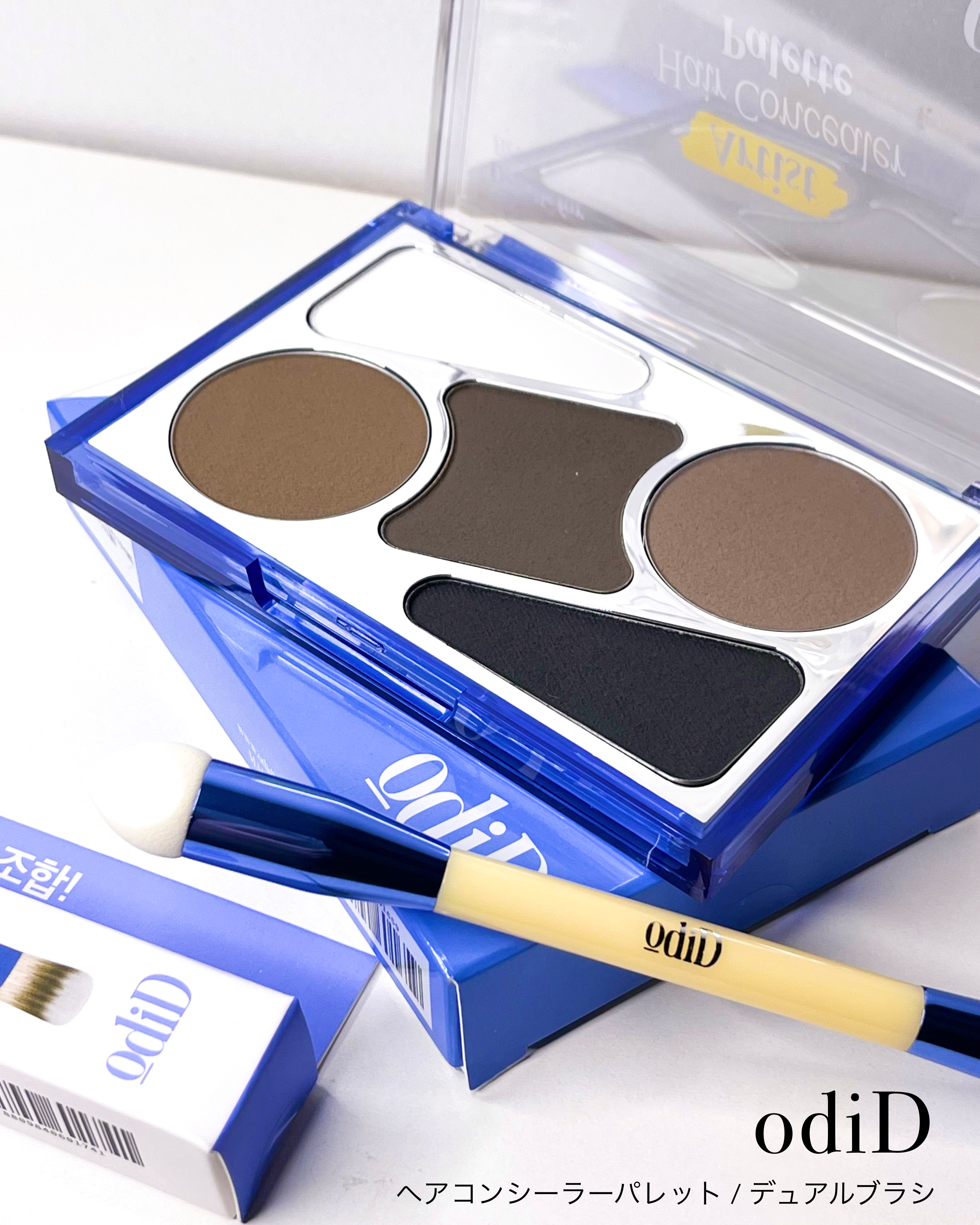 韓国のヘア系コスメで注目してるオーディッド🫶 モデルさんの髪色に合わせて色を作りやすいからいつも現場用バッグに入れて持ち歩いてます。 粉飛びしないジェリーテクスチャが優秀すぎて…! 粉飛びするとクレンジングでふき取ってファンデーション塗り直したりするので結構厄介なんですよね😩 皮脂をおさえるおしろい入りなところも、フルサイズのダブルエンドブラシがついてるのもかなりプロ好みというか現場向きで優秀。