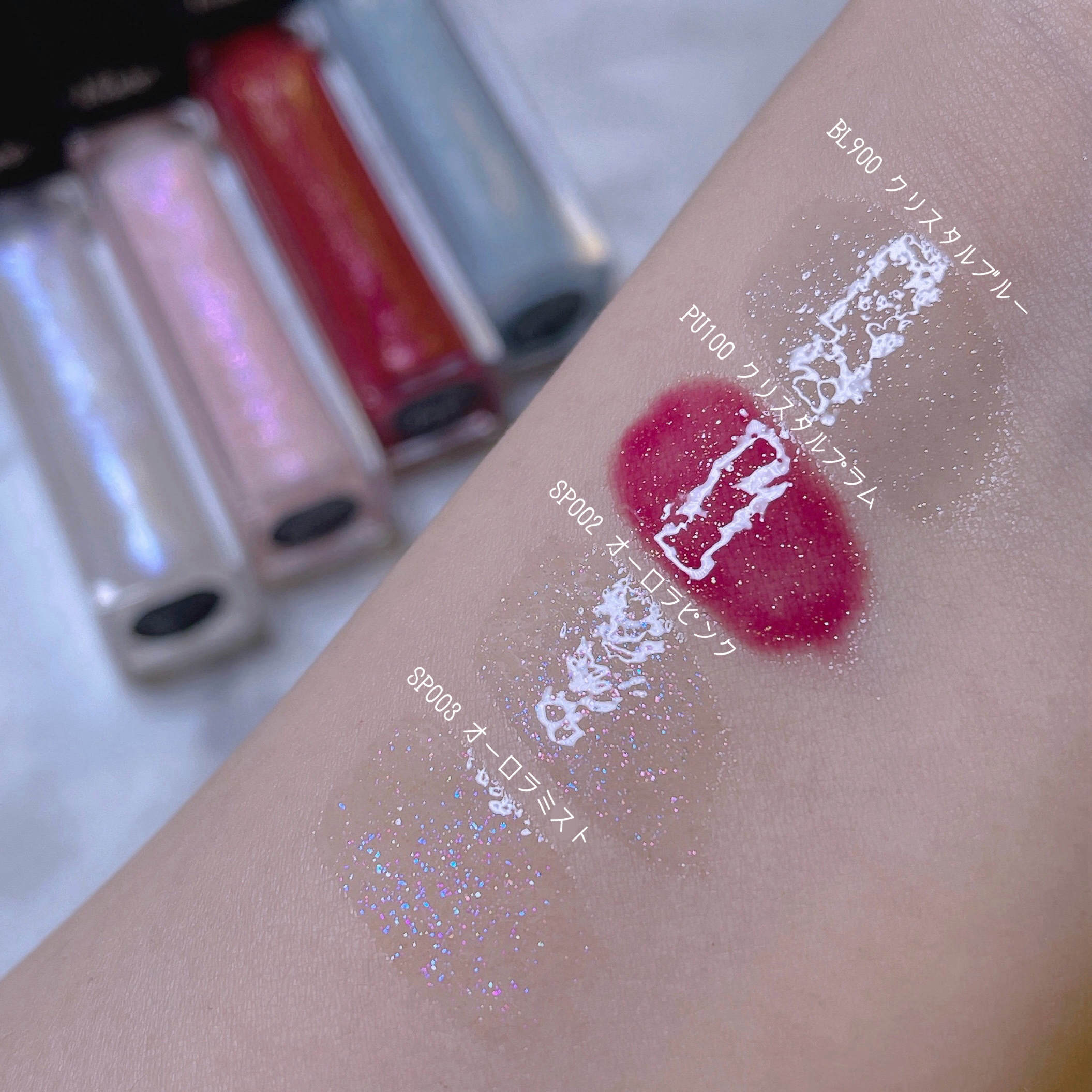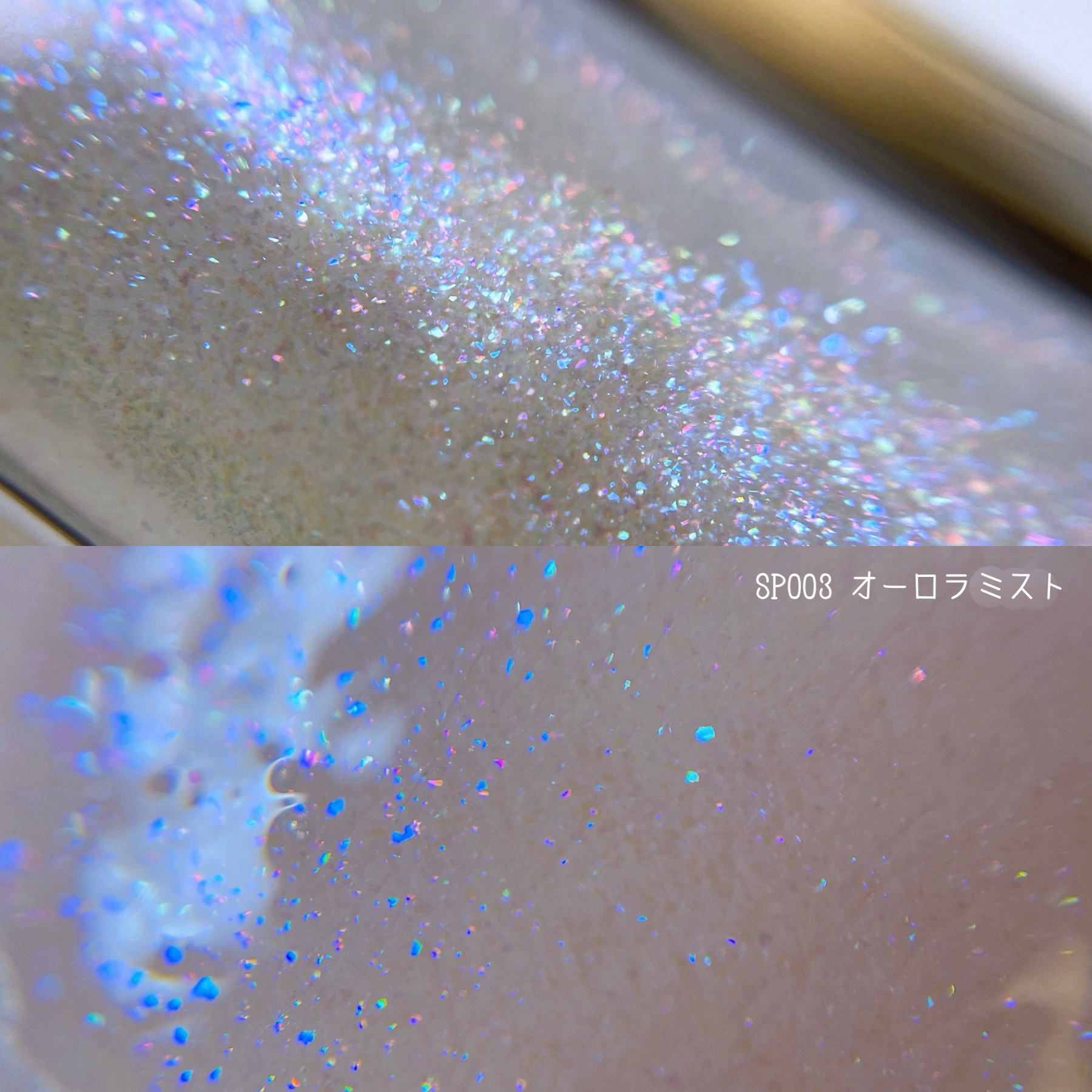 結局新色3色のうち、2色買い足し。 ブラウンレッドは使わないだろうと判断。 オーロラピンクとオーロラミストの違いは動画を見ていただくとわかるかな? ピンク系多めの多色ラメとブルー系多めの多色ラメになってます。