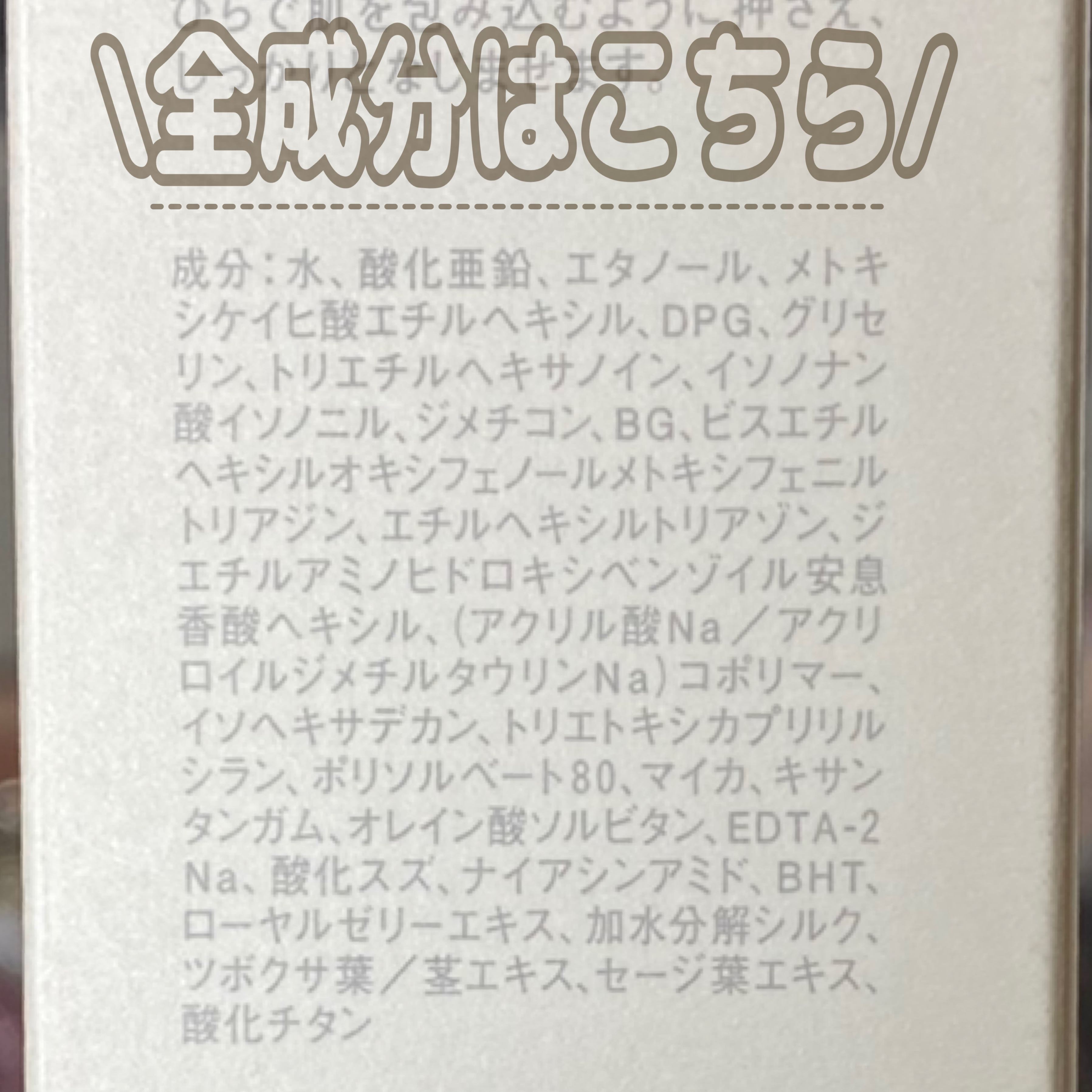 - <RMK UVフェイスプロテクター エンハンスト> 水、酸化亜鉛、エタノール、メトキシケイヒ酸エチルヘキシル、DPG、グリセリン、トリエチルヘキサノイン、イソノナン酸イソノニル、ジメチコン、BG、ビスエチルヘキシルオキシフェノールメトキシフェニルトリアジン、エチルヘキシルトリアゾン、ジエチルアミノヒドロキシベンゾイル安息香酸ヘキシル、(アクリル酸Na/アクリロイルジメチルタウリンNa)コポリマー、イソヘキサデカン、トリエトキシカプリリルシラン、ポリソルベート80、マイカ、キサンタンガム、オレイン酸ソルビタン、EDTA-2Na、酸化スズ、ナイアシンアミド、BHT、ローヤルゼリーエキス、加水分解シルク、ツボクサ葉/茎エキス、セージ葉エキス、酸化チタン