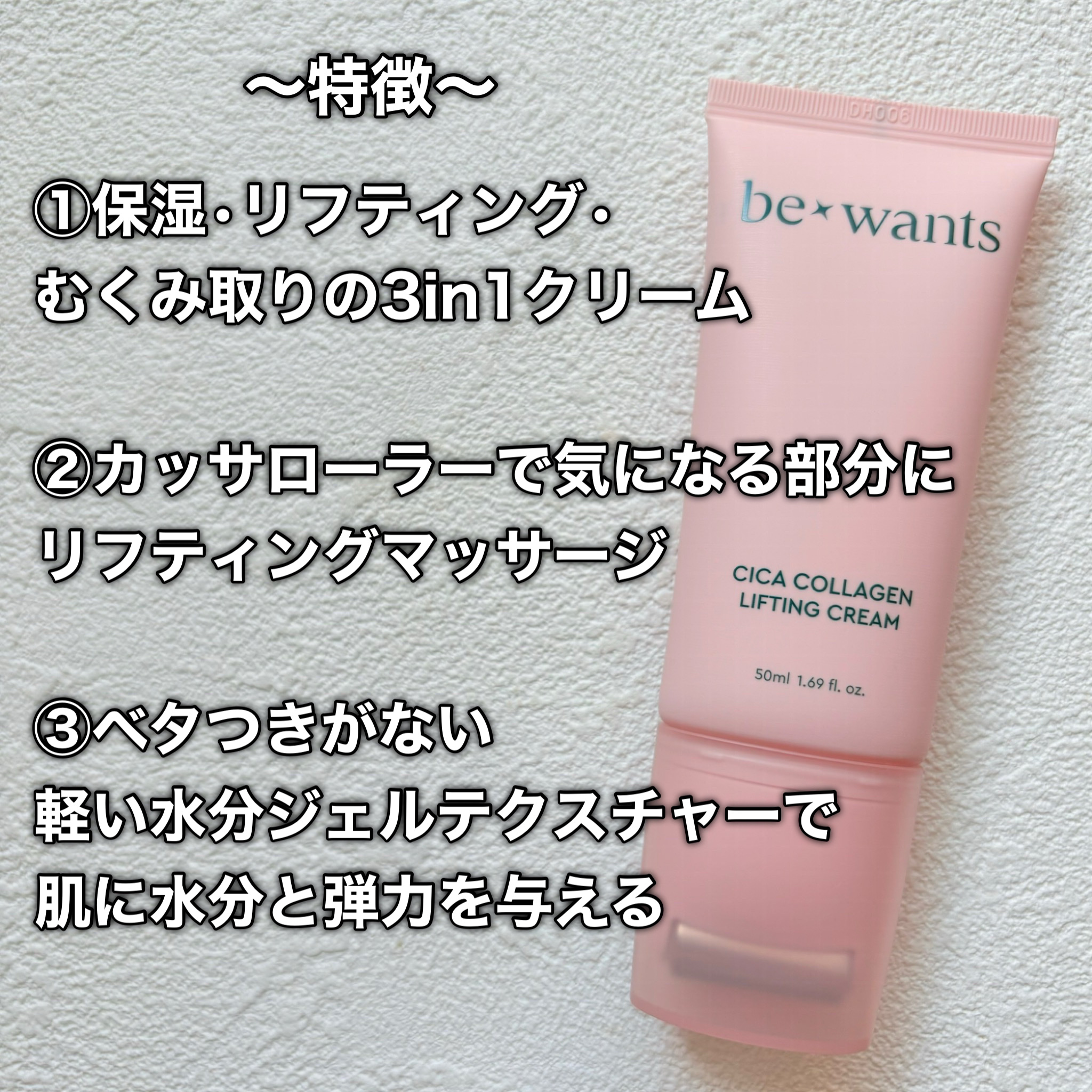 少し前にブルームボックス様のハッシュタグキャンペーンに当選していただきました。bewantsシカコラーゲンリフティングクリームチューブを押してクリームを出し、フェイスラインに沿ってコロコロしながらなじませます。押しただけだと、クリームが出てる...