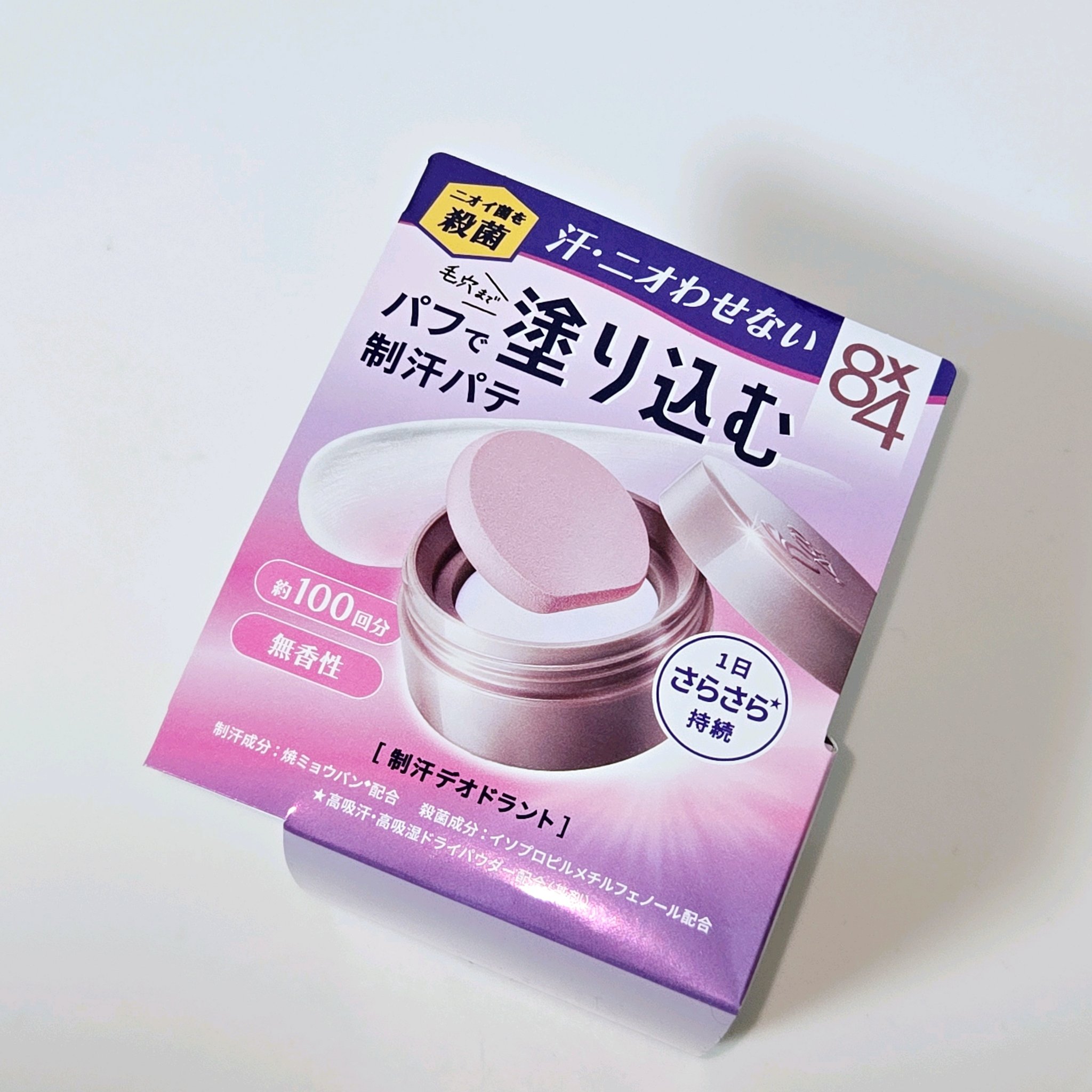 一日ずっと汗・ニオイを防ぐ 汗・ニオイに悩んでいる方に向け、ワキなど汗・ニオイが気になる箇所に、クッションパフで柔らかい「パテ」を塗り込むことで、毛穴まで入り込んでピタッと密着する、新タイプの制汗デオドランド剤が登場。 8x4最高のさらさら感を実現し、汗が気になる時でも1日ずっとさらさらが持続、また、殺菌成分が汗のニオイの元となるニオイ菌を殺菌して1日ずっと汗ニオわせません。 弾力のある専用のクッションパフで柔らかいパテを塗り込むことで、ムラなく塗れて毛穴までピタッと密着します。