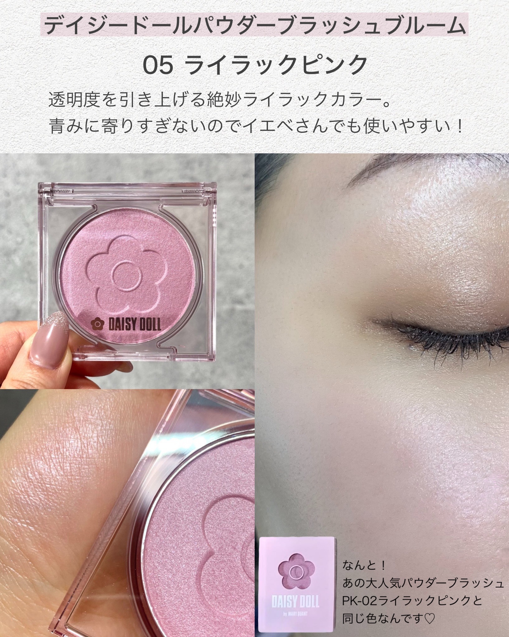 自然なツヤ感が上品で、ヘルシーでフレッシュな イエベさんおすすめの色味でした♪ 見た目は血色感があまり感じられなかったけどお肌にのせるとふわっと血色感が出てびっくり🫢 DAISY DOLL by MARY QUANT🌼 マリクワのセカンドブランドのデイジードール