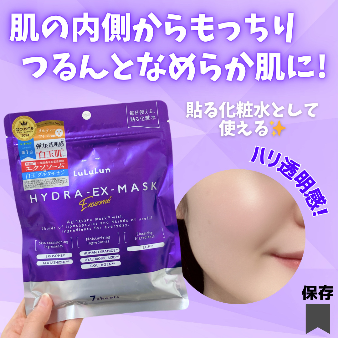 LuLuLunルルルンハイドラEXマスク28枚入/¥2,640(税込)ルルルンハイドラシリーズ💟先端再生テクノロジーにインスパイアされた、デイリーエイジングケア*マスク✨エクソソーム➡整肌成分ヒト脂肪由来間葉系細胞エクソソームグルタチオン➡弾...