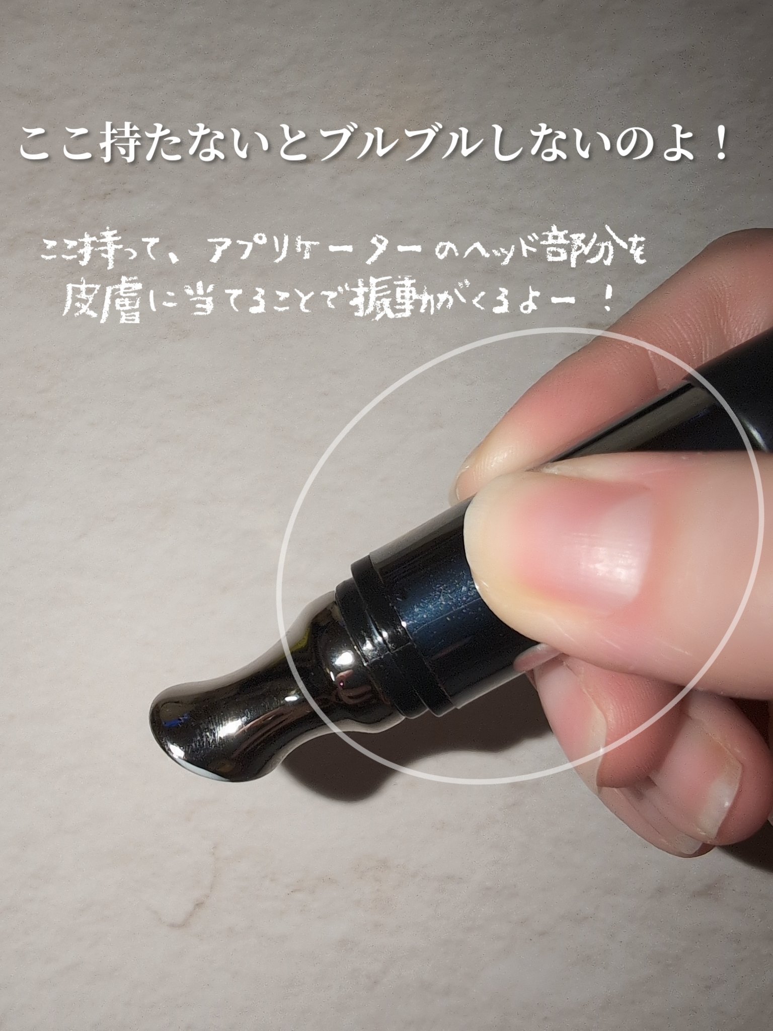 アプリケーターの金属部分を持ちながら目元にヘッドをあてるとブルブル振動💡 超微細振動で1分間に約12000回振動するので有効成分を効果的に浸透*させることができるよ😌 たるみケア、ボリュームケア、シワケアにピッタリ☝️✨ 目元だけでなく口元や首にも使用できるのでスキンケアの最後に気になるところに使ってね🫶 ベタつかないのにしっとりした仕上がりでとても使いやすいよ💓