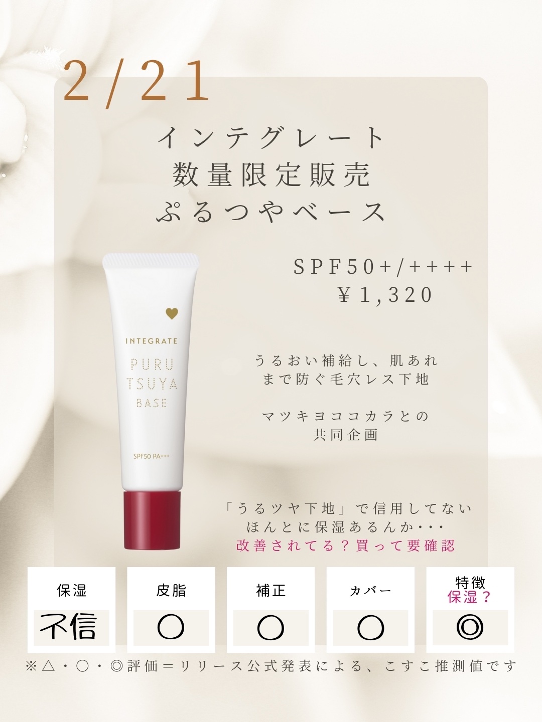 乾燥肌向けとはいえ、コレは脂性肌・インナードライ・混合肌さんも是非試して欲しい。 潤浸保湿・・・と、保湿感強めなネーミングですが…紫外線散乱材特有の幕感強め。説明会楽しみ。 元々の良さをそのままに、色付いてきたらしい・・・ファンデの仕上がりをバチっと決めてくる下地・・・けど、これ元々肌負担感を感じてたのでリニューアルで試したい。