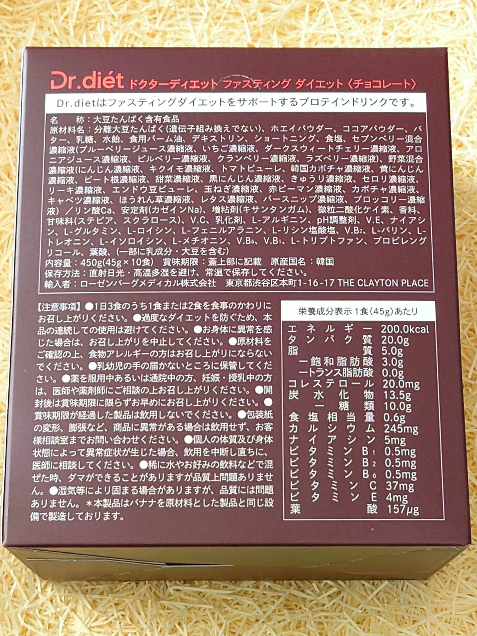 - 「Dr.diet ドクターディエット ファスティング ダイエット」の公式ショップが登場し、日本でも話題になっています。 一定期間、固形物を断食することで内臓などの消化機能を休ませカラダの内側からきれいにするファスティングは、健康維持や体質改善といった健康面だけでなく、美容面でも良いとされ人気が広がっています。3日~1週間程度、1日3食を飲み物に置き換えるダイエット方法として取り入れる人が多く、近年ファスティングのニーズが高まっています。 「Dr.diet ドクターディエット ファスティング ダイエット」は、1食当たり20gのたんぱく質の他、ビタミン、アミノ酸、野菜や果物など複数のこだわりの成分を配合し、栄養バランスが整ったプロテインドリンクです。無駄のないカラダを目指したサポートをします。口に広がるチョコレートの味わいは嬉しい美味しさです。 手軽に続けられるファスティングプログラムでカラダの内側からリセットしてみてはいかがでしょうか。