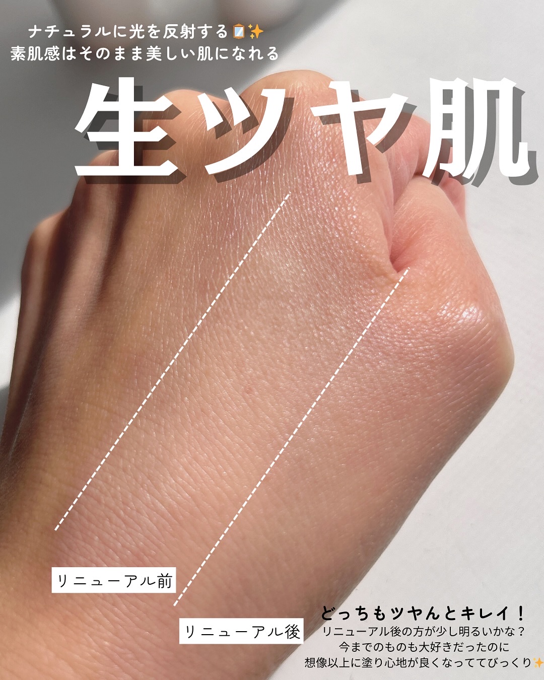 生ツヤ肌✨ ほんのりローズピンクなカラーが白浮きしにくく自然と肌色に馴染んでくれるから使いやすい😊 特にツヤ感が欲しい部分の頬骨とか目の下あたりは、光が反射しやすい部分だからとってもキレイに見えますよ💖 SPF50+・PA++++ 入っているから嬉しい☀️