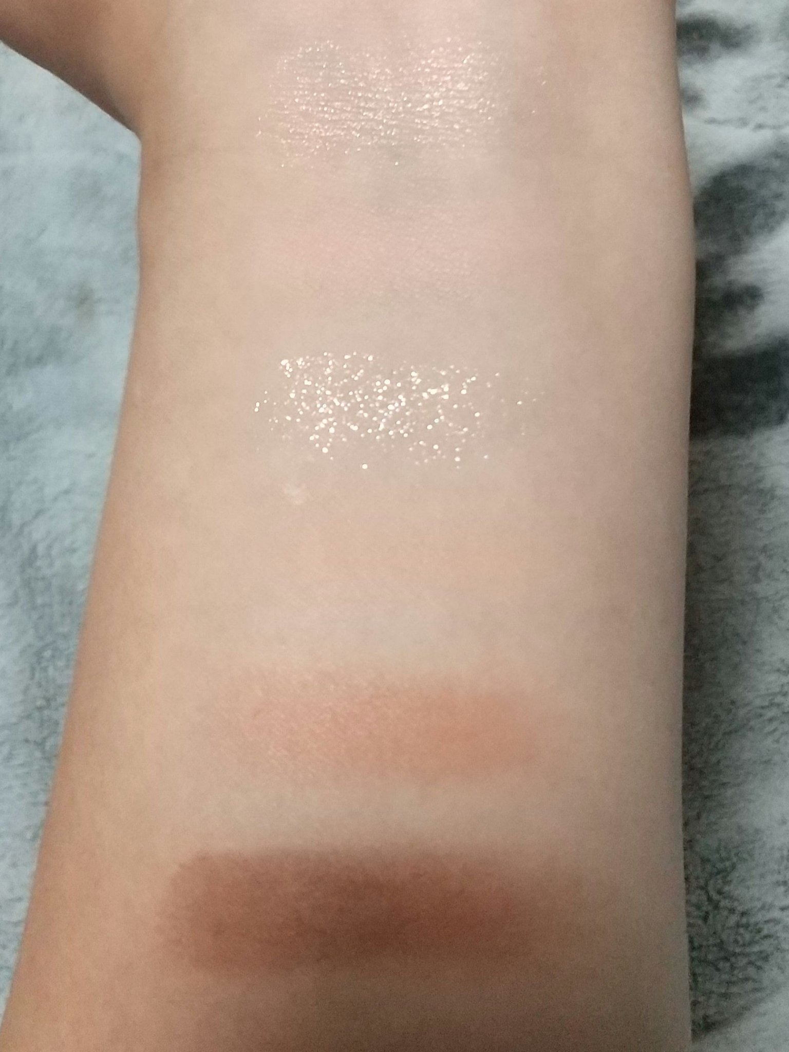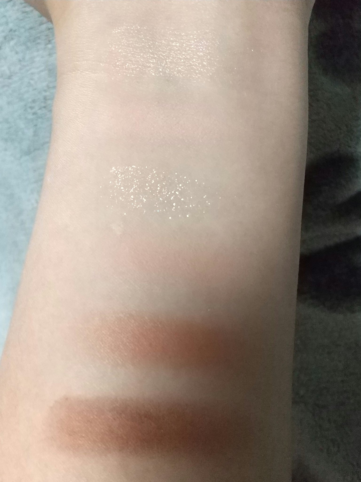 左上、左下、真ん中上、真ん中下、右上、右下という順番でスウォッチしてみました。 出してみると商品の写真より肌にのせたほうがくすみが出るかな✨という印象です😌 伸ばしやすくて指でも筆でもつけやすいです☺️💕 とっても可愛いカラーなのでオススメです💠