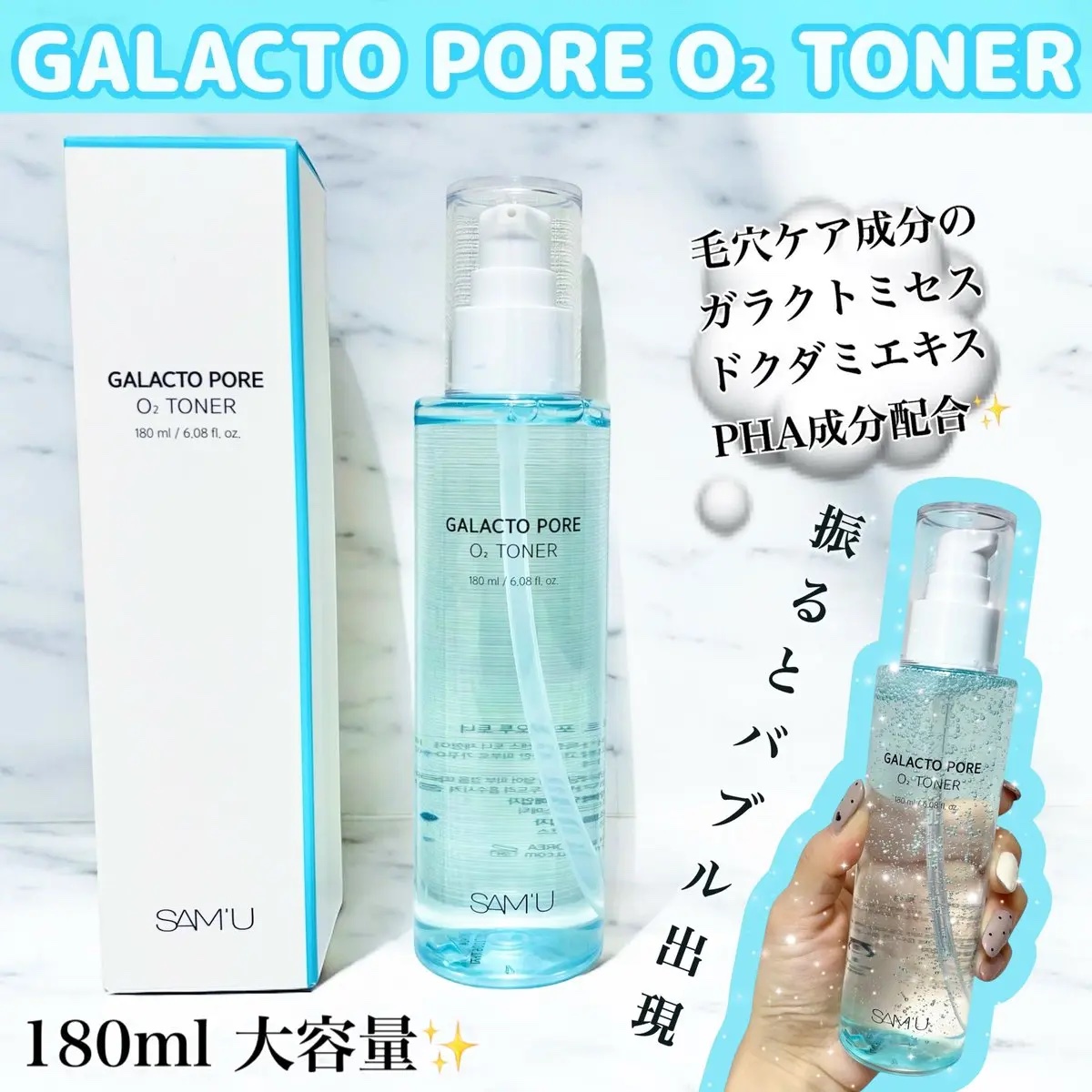 - ガラクトシリーズより新しく登場したガラクトポアオーツー(O2)トナー。 新感覚の酸素を含んだバブルエッセンスが毛穴奥の老廃物や過剰な皮脂で塞がれている毛穴をクリアにして肌のキメを整えます。 また、トナーに含まれた酸素は肌に活力を与え、より効果的に老廃物の排出を促すことで肌のデトックス効果を促します。 ガラクト酵母成分により敏感なお肌でも刺激を与えずに毛穴ケアが可能です。 しっとりべたつきのないテクスチャーでお肌に負担なく朝晩使用でき、さらに毛穴開きを防ぐため肌表面に潤いを与えます。 皮膚低刺激テスト完了済により敏感肌の方もご使用いただけます。 <特長成分> 酸素 : 酸素バブルで毛穴に詰まった老廃物を効果的に除去されるようサポート。(皮脂、角質除去) ガラクトミセス発酵ろ過物 : 肌にやさしい天然酵母により、低刺激に角質除去サポート。(角質除去) ウィッチヘーゼル : 毛穴の引き締めや皮脂分泌を調節ケアに効果的。( 整肌成分 ) PHA : 敏感肌でも使用できる角質ケア成分配合。(角質除去) <テクスチャー&香り> - テクスチャー しっとり伸びやすく肌になじみやすいテクスチャー - 香り シトラスハーブ系