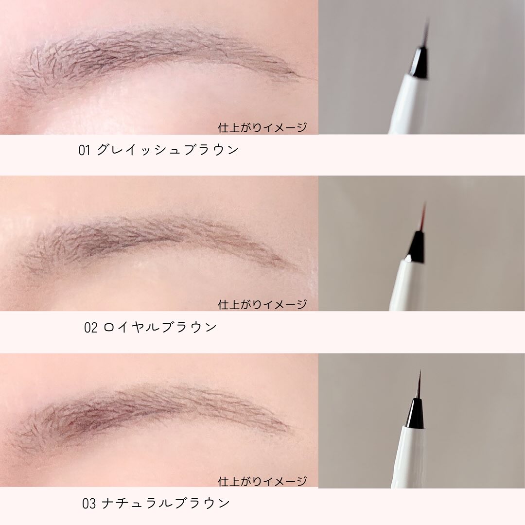 流星級0.01mmラインでリアルな仕上がりが叶う♡超極細リキッドアイブロウ🌠 まるで自眉のようにリアルな0.01mmラインが描ける超極細筆を採用しているから不器用な私でも1本1本綺麗に描ける🖌️ 今回は黒髪や暗めの髪色の方にオススメの01 グレイッシュブラウンを使ってみたよ!自眉とほぼ同じ色だから眉マスカラを使わなくても大丈夫👌 独自の染料処方を採用しているから1日中落ちにくいよ👀 特に眉尻がキリッと綺麗に描けるから眉尻がぼんやりしがちで苦手意識がある人にオススメしたい!