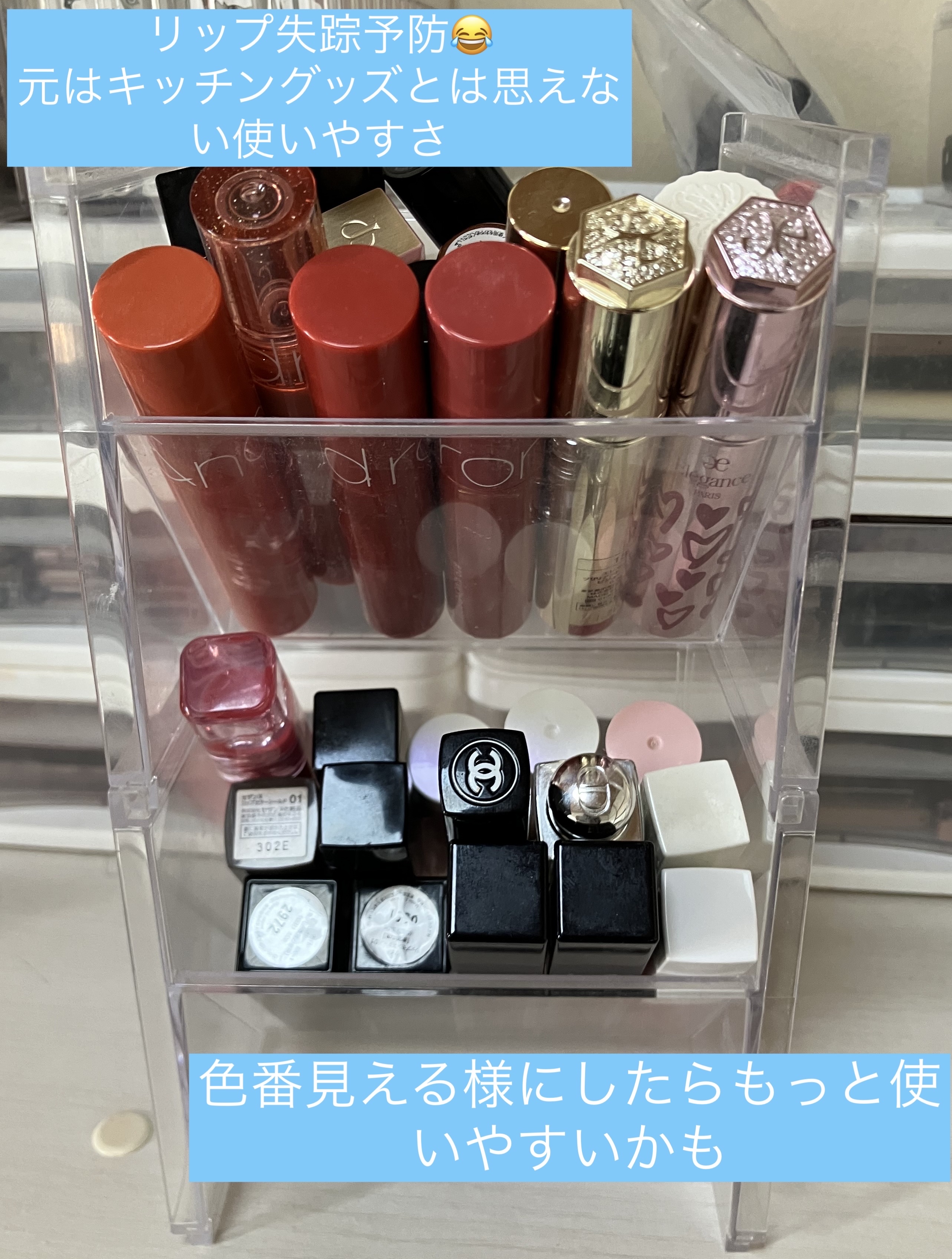 100均と家にあった収納でコスメ収納! 棚はカラーボックスです! 使用頻度の高いものはカラーボックスの上段、使用頻度の低いものは下段に置いてます。 手持ちのコスメが一望できるから、コスメを買いすぎない気がします