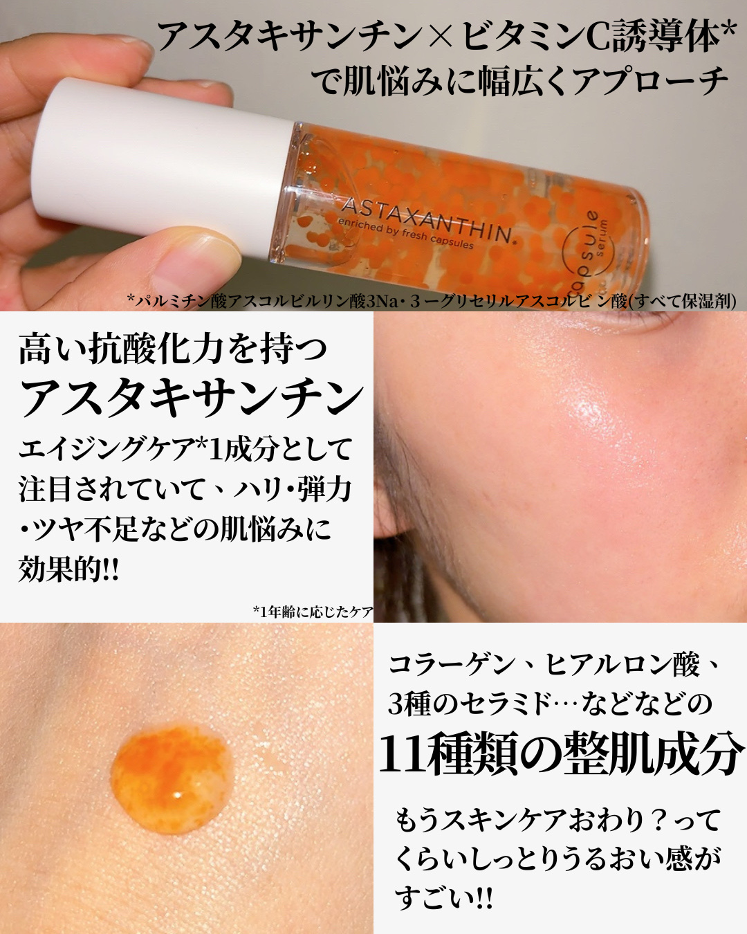- 〇注目のエイジングケア※4成分アスタキサンチン※5を厳選配合 〇アスタキサンチンはこだわりの天然由来 〇アスタキサンチン×ビタミンC誘導体※6が総合的にアプローチ 〇コラーゲン、ヒアルロン酸、3種のセラミド、ナイアシンアミド、ツボクサエキス(CICA)、フラーレン等11種類の整肌成分も同時に配合 〇毛穴※1、ざらつき※3、くすみ・透明感※2、ハリ・弾力、うるおい不足もコレ1つ。5in1美容液。 価格:2,981円(税込)※7 ※1乾燥による毛穴の開き ※2、3乾燥による ※4年齢に応じたうるおいケア ※5アスタキサンチン(皮膚コンディショニング剤) ※6パルミチン酸アスコルビルリン酸Na、3-グリセリルアスコルビン酸(酸化防止剤) ※7公式ストアでの販売価格