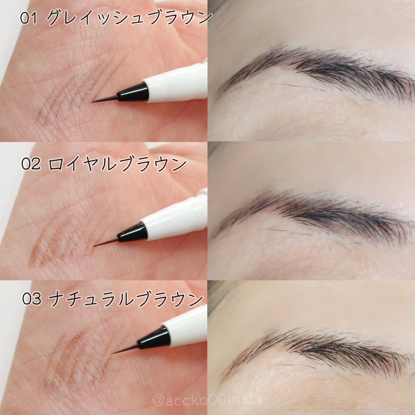 - ① 描きやすさにこだわった超極細筆 厳選した2種の毛を混毛し、職人による手組で仕上げた筆を採用。1本1本繊細なラインが描け、まるで自眉のような仕上がりに。 ② ラスティングと鮮明な発色を叶える独自処方 肌の表面を染め※1ラスティングを発揮する、独自の染料処方を採用。一日中落ちずに、鮮明な発色を叶えます。 ※1 メイクアップ効果による