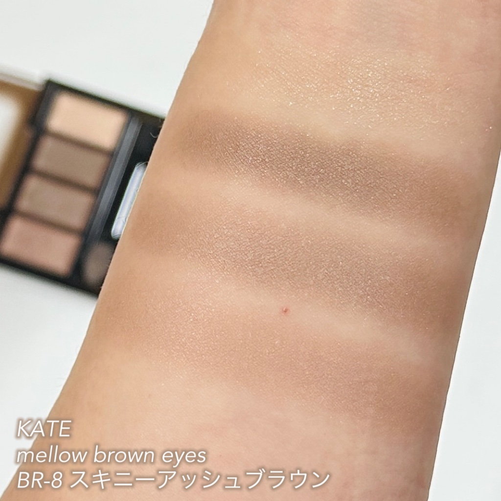 KATEケイトメロウブラウンアイズBR-8スキニーアッシュブラウン¥1,320スモーキーな色合いのブラウンシャドウ🤎粉質はサラサラしてる感じで繊細なパールが可愛い︎💕︎︎1番右のクリアパールカラーを重ねるともっとキラキラになる❗️涙袋とまぶた...