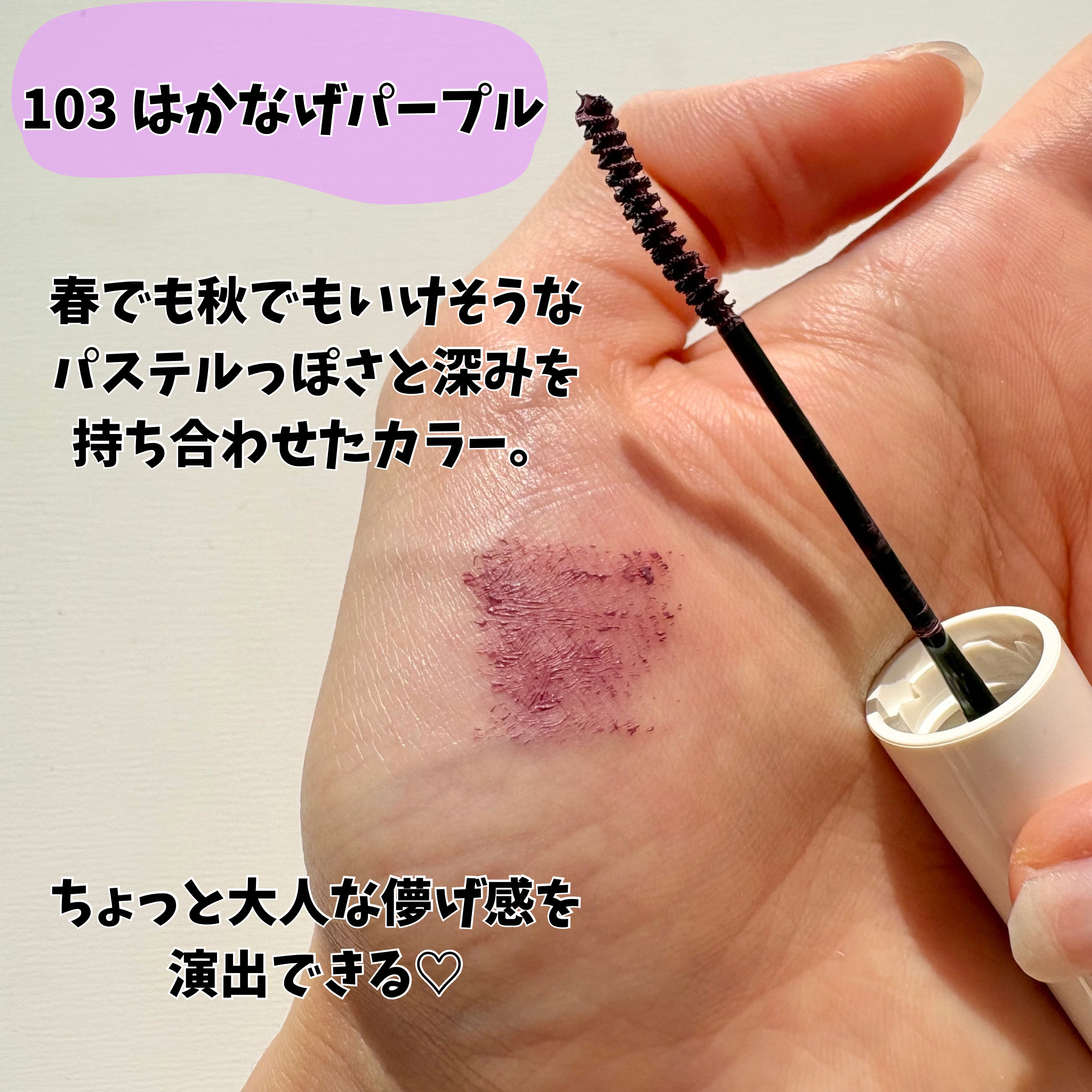 - <01 ブラック> 水、(アクリレーツ/アクリル酸エチルヘキシル)コポリマー、キャンデリラロウ、(アクリレーツ/VA)コポリマー、BG、水添アビエチン酸グリセリル、ミツロウ、エタノール、シリカ、ステアリン酸、セテアリルアルコール、パラフィン、イソステアリン酸デキストリン、TEA、ポリステアリン酸スクロース、ステアリン酸グリセリル(SE)、ポリソルベート80、オリーブ果実油、ゴマ種子油、サフラワー油、シア脂、ホホバ種子油、EDTA-2Na、PEG-20ソルビタンココエート、アクリレーツコポリマー、シメチコン、スクワラン、セスキオレイン酸ソルビタン、セテス-25、タルク、パルミチン酸デキストリン、ヒドロキシエチルセルロース、ポリアクリル酸Na、ポリビニルアルコール、マイクロクリスタリンワックス、ミネラルオイル、ラウリル硫酸Na、ラウレス-21、ラウロイルリシン、デヒドロ酢酸Na、フェノキシエタノール、メチルパラベン、酸化鉄 <101 あどけなブルー(限定)> 水、(アクリレーツ/アクリル酸エチルヘキシル)コポリマー、キャンデリラロウ、(アクリレーツ/VA)コポリマー、BG、水添アビエチン酸グリセリル、ミツロウ、エタノール、ステアリン酸、セテアリルアルコール、パラフィン、イソステアリン酸デキストリン、TEA、シリカ、ポリステアリン酸スクロース、ステアリン酸グリセリル(SE)、ポリソルベート80、オリーブ果実油、ゴマ種子油、サフラワー油、シア脂、ホホバ種子油、EDTA-2Na、PEG-20ソルビタンココエート、アクリレーツコポリマー、シメチコン、スクワラン、セスキオレイン酸ソルビタン、セテス-25、タルク、ヒドロキシエチルセルロース、ポリアクリル酸Na、ポリビニルアルコール、マイクロクリスタリンワックス、ミネラルオイル、ラウリル硫酸Na、ラウレス-21、ラウロイルリシン、水酸化Al、デヒドロ酢酸Na、フェノキシエタノール、メチルパラベン、グンジョウ、酸化チタン、酸化鉄 <102 可憐ピンク(限定)> 水、(アクリレーツ/アクリル酸エチルヘキシル)コポリマー、キャンデリラロウ、(アクリレーツ/VA)コポリマー、BG、水添アビエチン酸グリセリル、ミツロウ、エタノール、ステアリン酸、セテアリルアルコール、パラフィン、イソステアリン酸デキストリン、TEA、シリカ、ポリステアリン酸スクロース、ステアリン酸グリセリル(SE)、ポリソルベート80、オリーブ果実油、ゴマ種子油、サフラワー油、シア脂、ホホバ種子油、EDTA-2Na、PEG-20ソルビタンココエート、アクリレーツコポリマー、シメチコン、スクワラン、セスキオレイン酸ソルビタン、セテス-25、タルク、ヒドロキシエチルセルロース、ポリアクリル酸Na、ポリビニルアルコール、マイクロクリスタリンワックス、ミネラルオイル、ラウリル硫酸Na、ラウレス-21、ラウロイルリシン、水酸化Al、デヒドロ酢酸Na、フェノキシエタノール、メチルパラベン、グンジョウ、酸化チタン、酸化鉄、赤226 <103 はかなげパープル(限定)> 水、(アクリレーツ/アクリル酸エチルヘキシル)コポリマー、キャンデリラロウ、(アクリレーツ/VA)コポリマー、BG、水添アビエチン酸グリセリル、ミツロウ、エタノール、ステアリン酸、セテアリルアルコール、パラフィン、イソステアリン酸デキストリン、TEA、シリカ、ポリステアリン酸スクロース、ステアリン酸グリセリル(SE)、ポリソルベート80、オリーブ果実油、ゴマ種子油、サフラワー油、シア脂、ホホバ種子油、EDTA-2Na、PEG-20ソルビタンココエート、アクリレーツコポリマー、シメチコン、スクワラン、セスキオレイン酸ソルビタン、セテス-25、タルク、ヒドロキシエチルセルロース、ポリアクリル酸Na、ポリビニルアルコール、マイクロクリスタリンワックス、ミネラルオイル、ラウリル硫酸Na、ラウレス-21、ラウロイルリシン、水酸化Al、デヒドロ酢酸Na、フェノキシエタノール、メチルパラベン、グンジョウ、酸化チタン、酸化鉄、赤226