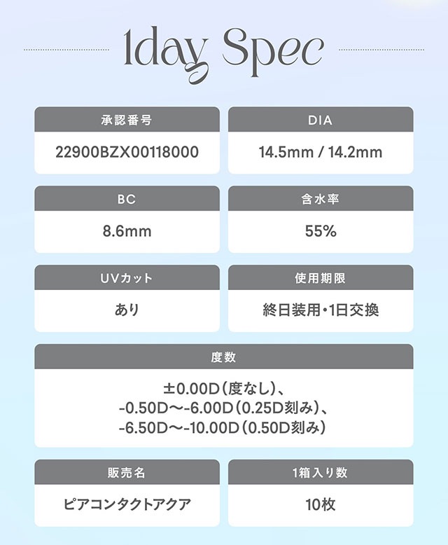 - ※2025年6月以降、商品パッケージ裏面・側面の一部表記を変更いたします。尚、これにかかる商品の交換・返品は承っておりません さりげなくいつもと違う自分をアピールしたい。 そんな女の子たちにいつまでも「いま欲しい!」と思ってもらえるレンズを目指してデザインしました。 落ち着きすぎず、明るすぎない、ナチュラルサイズで目になじみながら発色を感じられるデザインをそろえています。 カラーコンタクトレンズの不適正使用による眼障害の危険性等などがあります。 ●コンタクトレンズは高度管理医療機器です。不十分な洗浄・消毒など不適切なケアや、長時間・交換期間を超えた装用により、アレルギー性結膜炎、角膜感染症、角膜潰瘍等の重篤な眼障害が発生する危険性があります ●ご使用前に取扱説明書を確認してください 使用上の留意事項 ●眼科医院等を受診してからお求めください ●眼に異常を感じたら直ちにレンズ使用を中止し、お近くの眼科等で診察を受けてください ●医師の指示にしたがってご使用ください ●コンタクトレンズを装用する場合、自覚症状がなくても、眼科医院等での定期検査を受けてください ●レンズに不具合がある場合は使用しないでください