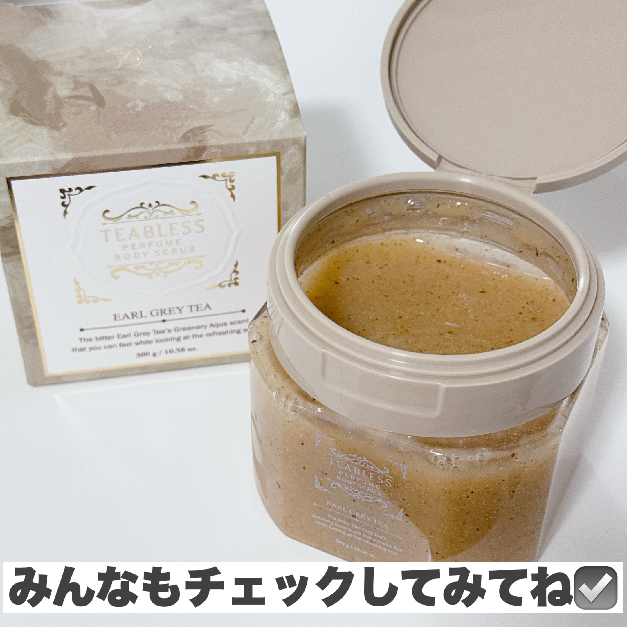 .TEABLESSアールグレイティージャム・ボディスクラブ✔︎スクラブ兼ボディソープ乾いた肌にスクラブ剤として塗り広げて、不純物や角質を取り除く。その後水を加えると泡立ってボディソープに🫧✔︎柔らかい角質除去のための紅茶の葉と、水分補給のため...