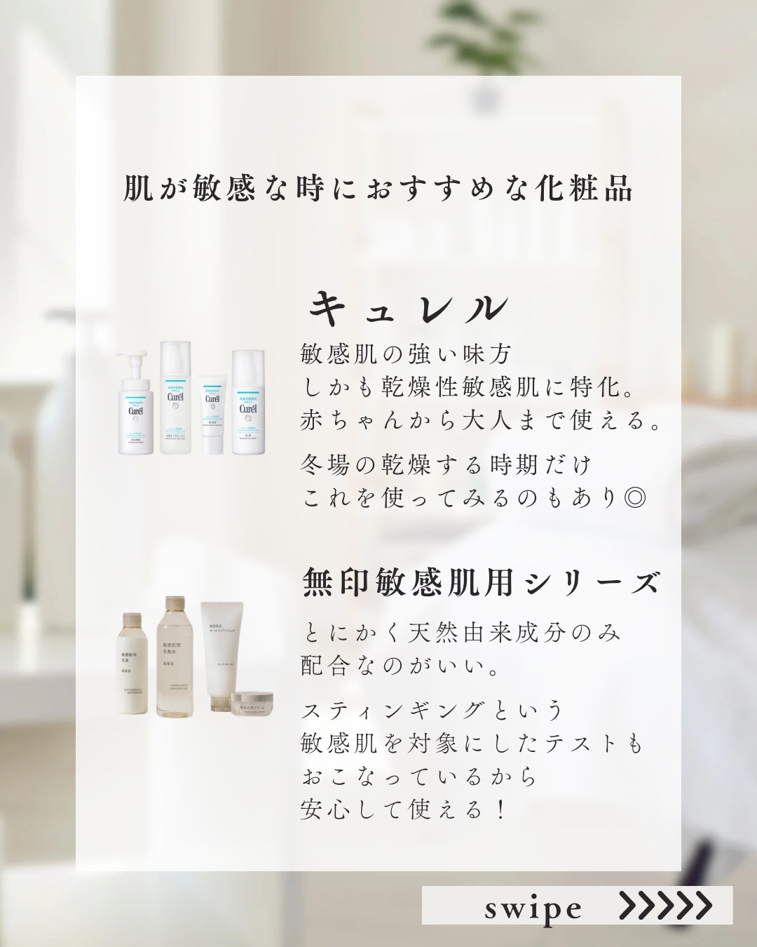 肌が弱い気がするけど、何が原因か分からない…そんな人のために、敏感肌チェックリストを作りました! まずは自分の肌タイプを知ることから始めよう✨ 使った商品はどれもいい!! ただ全部揃えるとコスパが……って感じかな🤔 チェックリストは4枚目と5枚目にあるよ💖 自分でチェックしてみてね!
