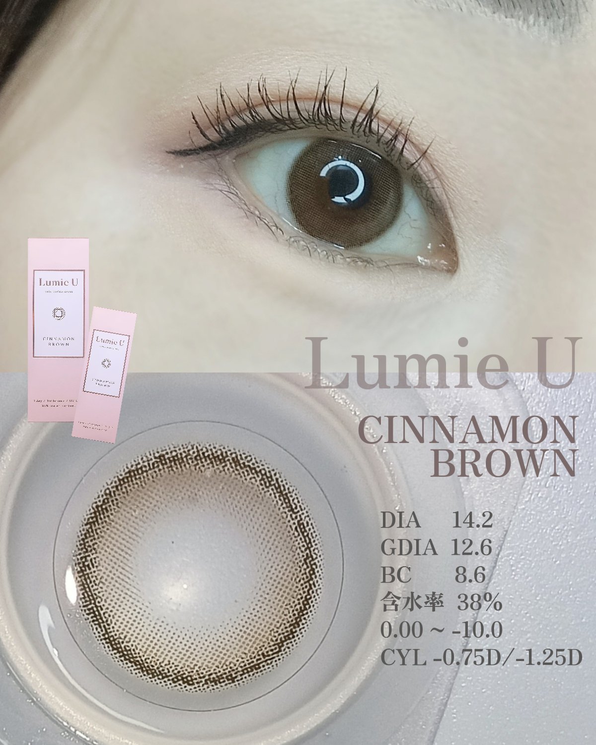- ※2025年6月以降、商品パッケージ裏面・側面の一部表記を順次変更いたします。尚、これにかかる商品の交換・返品は承っておりません。 ”欲しいのは 大人の透明感”がコンセプト。 黒目のサイズはそこまで変えず、質感だけをナチュラルにキラリと整えてくれるレンズデザインが特徴となっています。 誰でも“裸眼の綺麗な人”に見せてくれる、全2色のラインナップです。 CINNAMON BROWN(シナモンブラウン) DIA 14.2mm / 着色直径12.6mm 透明感のあるシナモンカラー×細フチデザイン 瞳、本来の美しさを引き立てる裸眼風レンズ ALMOND BROWN(アーモンドブラウン)DIA 14.2mm / 着色直径12.6mm 温かみのあるアーモンドカラー×細フチデザイン 瞳、本来の美しさを引き立てる裸眼風レンズ GEM CHOCOLAT(ジェムショコラ)DIA:14.2mm / 着色直径:12.8mm 光を取り込むショコラブラウンカラー×瞳に馴染むふんわりぼかしフチデザイン 瞳、本来の美しさを引き立てる裸眼風レンズ カラーコンタクトレンズの不適正使用による眼障害の危険性等などがあります。 ●コンタクトレンズは高度管理医療機器です。不十分な洗浄・消毒など不適切なケアや、長時間・交換期間を超えた装用により、アレルギー性結膜炎、角膜感染症、角膜潰瘍等の重篤な眼障害が発生する危険性があります ●ご使用前に取扱説明書を確認してください 使用上の留意事項 ●眼科医院等を受診してからお求めください ●眼に異常を感じたら直ちにレンズ使用を中止し、お近くの眼科等で診察を受けてください ●医師の指示にしたがってご使用ください ●コンタクトレンズを装用する場合、自覚症状がなくても、眼科医院等での定期検査を受けてください ●レンズに不具合がある場合は使用しないでください