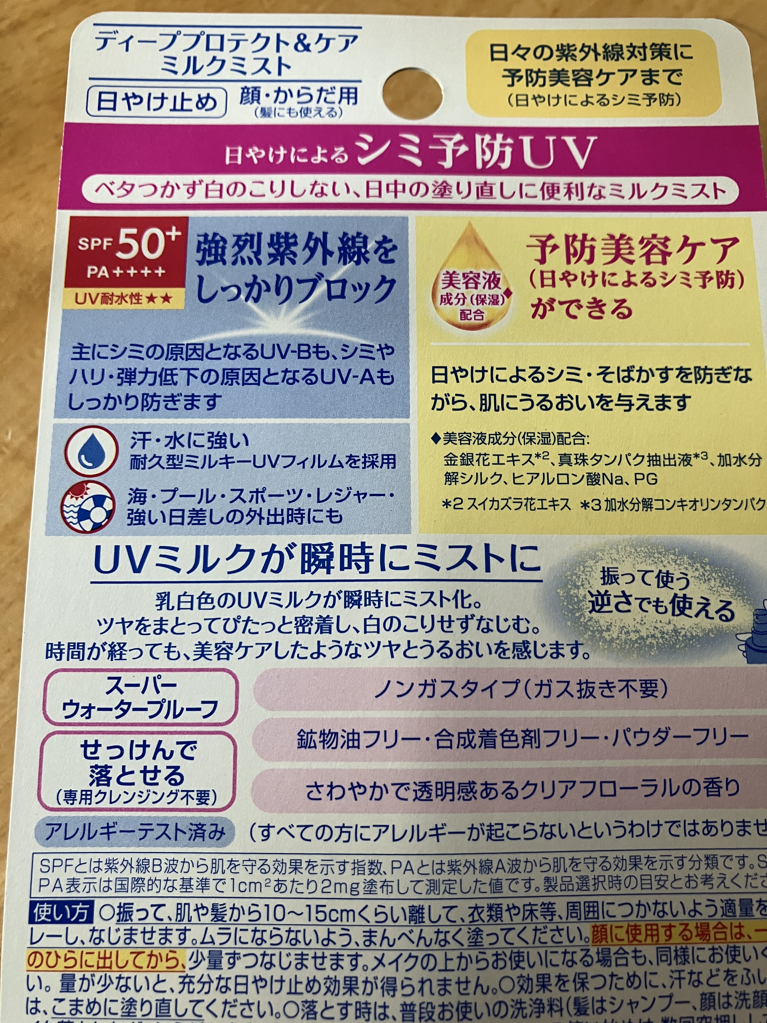 - ●強烈紫外線をしっかりブロック SPF50+/PA++++/UV耐水性★★ 主にシミの原因となるUV-Bも、シミやハリ・弾力低下の原因となるUV-Aもしっかり防ぎます。 ●汗・水に強い 耐久型ミルキーUVフィルムを採用 海・プール・スポーツ・レジャー・強い日差しの外出時にもおすすめです。 ●予防美容ケア(日やけによるシミ予防)ができる 日やけによるシミ・そばかすを防ぎながら、肌にうるおいを与えます。 美容液成分(保湿)配合: 金銀花エキス(スイカズラ花エキス)、真珠タンパク抽出液(加水分解コンキオリンタンパク)、 加水分解シルク、ヒアルロン酸Na、PG ★UVミルクが瞬時にミストに 乳白色のUVミルクが瞬時にミスト化。ツヤをまとってぴたっと密着し、白のこりせずなじみます。 時間が経っても、美容ケアしたようなツヤとうるおいを感じます。 〇スーパーウォータープルーフ 〇せっけんで落とせる(専用クレンジング不要) 〇ノンガスタイプ(ガス抜き不要) 〇鉱物油フリー、合成着色剤フリー、パウダーフリー 〇さわやかで透明感あるクリアフローラルの香り 〇アレルギーテスト済み(すべての方にアレルギーが起こらないというわけではありません) 〇顔・からだ用(髪にも使える)