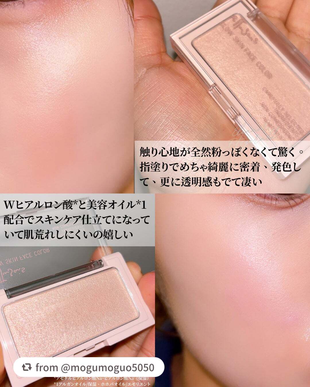 - パウダーなのに粉感ゼロ⁈ 指塗りでとけこむように密着 内側からにじみでたような血色・ツヤ仕上がりのフェイスカラー 〇新開発!とけこむような使用感の生感ツヤベース採用。 じわっと発色とツヤを実現。 ーとけこみ微粒子パウダー配合 ー透明感を引き出す透明ツヤUPパール配合 〇ブルベ・イエベ問わず誰でも使える透明肌を引き立てるカラー設計。 〇指塗りで密着。化粧くずれしにくい。 〇うるおいが長時間続く。スキンケア仕立て。 ーWヒアルロン酸(アセチルヒアルロン酸Na・ヒアルロン酸Na)(保湿) ー美容オイル配合(アルガンオイル/保湿、ホホバオイル/エモリエント) ー肌あれ防止ミネラルパウダー配合 〇洗顔料でオフ & フリー処方 ーフレグランスフリー・アルコール(エタノール)・パラベンフリー 〇アレルギーテスト済(すべての方にアレルギーが起きないというわけではありません) 〇ニキビのもとになりにくい処方(すべての方にニキビができないというわけではありません) ※一部店舗 2 5年2月発売