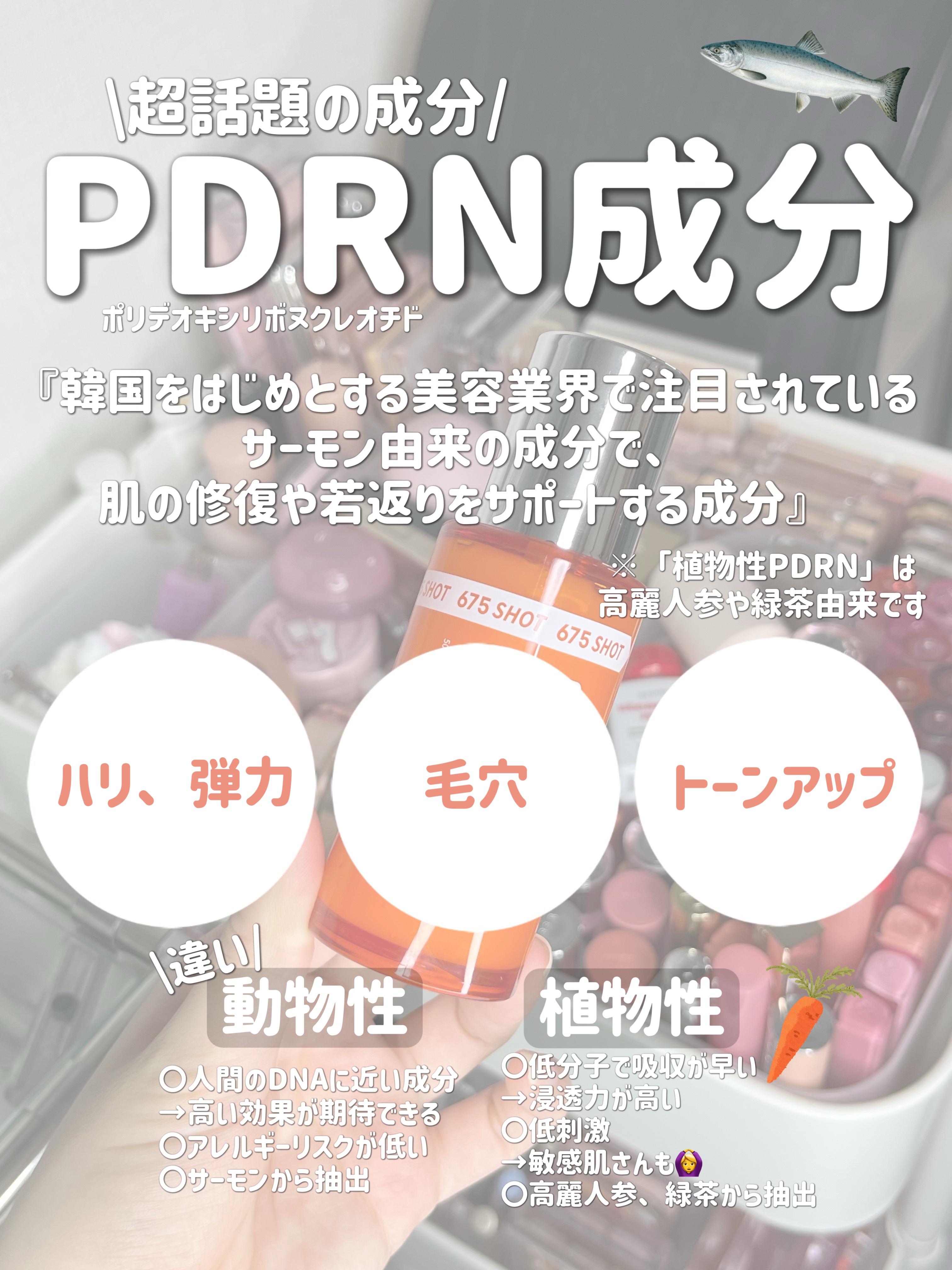 整肌成分サーモン由来PDRNを含み、さらに天然由来のニードルを配合した美容液。とろみがありますがみずみずしくお肌に馴染みます🍀 注目のサーモン由来PDRNは他の動物性PDRNに比べて人の皮膚と構造が似ていて、刺激が少なく親和性がありながら肌の再生や炎症に対するアプローチの機能も持っています🐟 整肌成分ナイアシンアミド・アデノシンと、あえて肌に刺激を与えて弾力性をアップしたりコラーゲンの生成を促進したりするニードルを含有しているため、よりお肌のハリ感に高く効果を発揮してくれますよ🤲