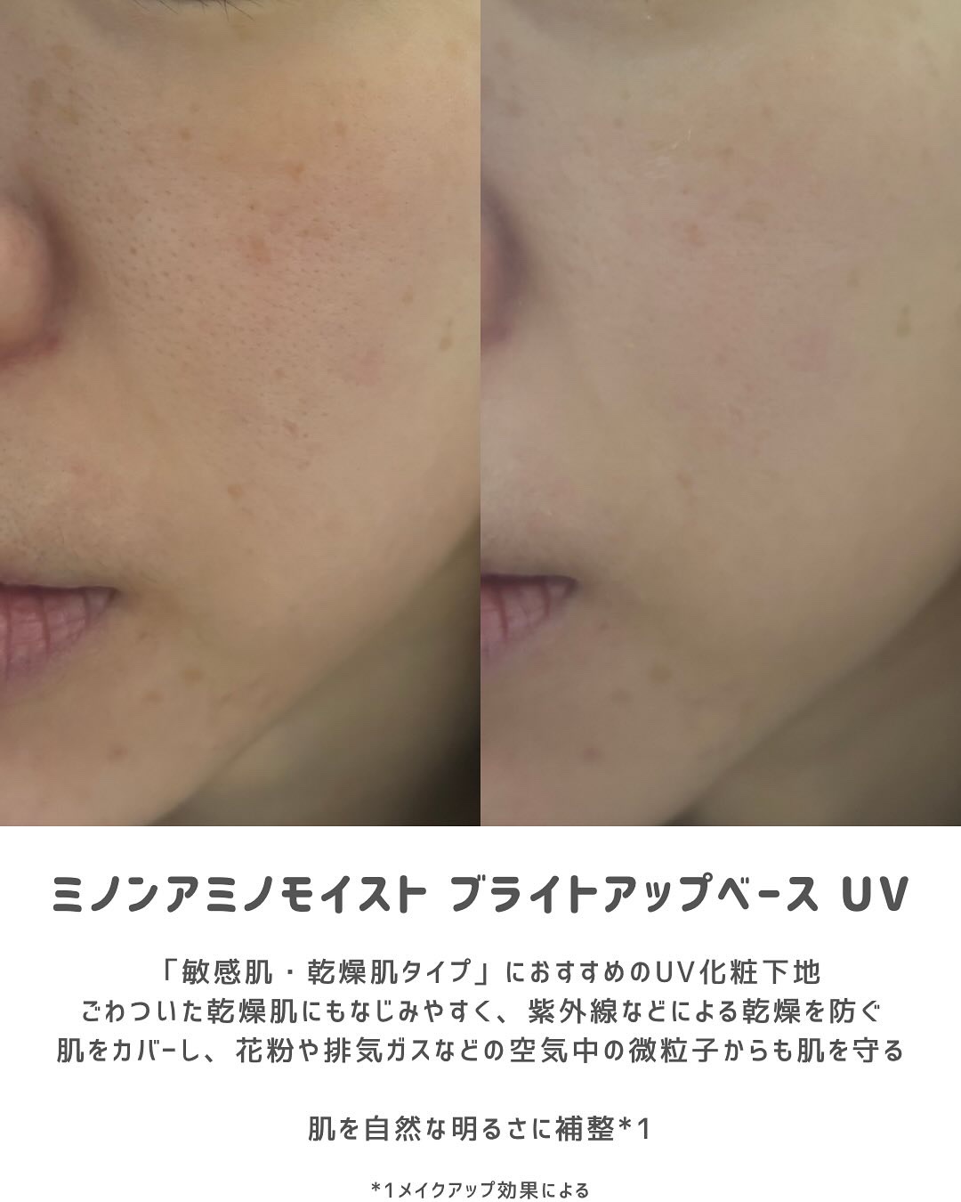 紫外線、乾燥などから肌を守る特徴がある化粧下地。 ブライトアップベース UVは乾燥肌の方におすすめ。SPF47 PA +++ 軽くてのびがいいテクスチャー。 毛穴落ちしにくく、黒ずみ毛穴もカバーしてくれて驚き🫢