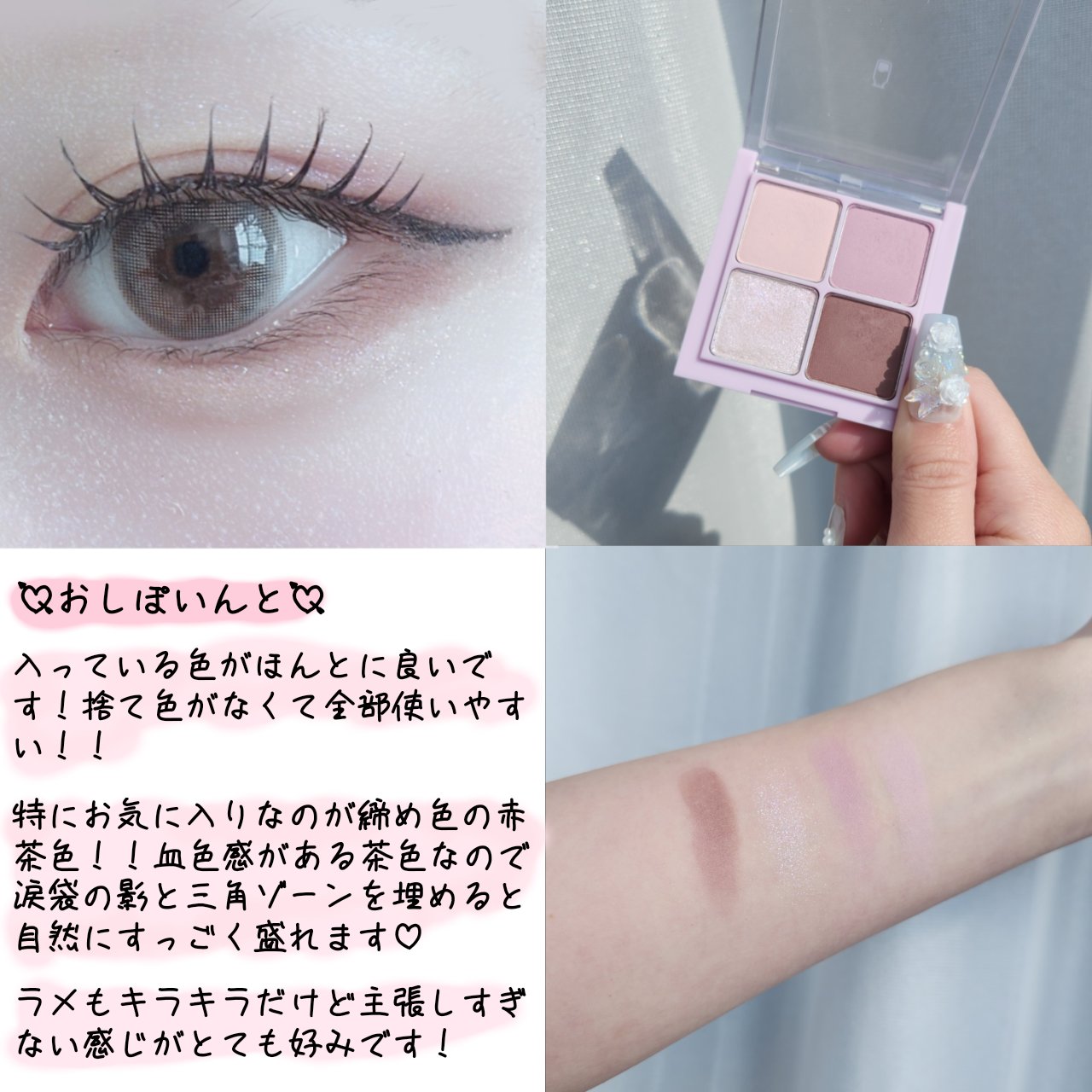 使いやすい色味! →白みピンクはベースカラーとしても優秀で涙袋に仕込むと血色感+立体感で超かわいいし、紫よりのピンクも全然浮かずに馴染みます! 1つでアイメイクが完成する! →画像のアイメイクは別のアイライナーを使ってますがパレットの茶色を使って描いてもかわいいです! 色落ちしやすい →今回の商品に限らず、私の肌だとrom&ndのアイシャドウは落ちやすいので、相性の問題もあると思います💦