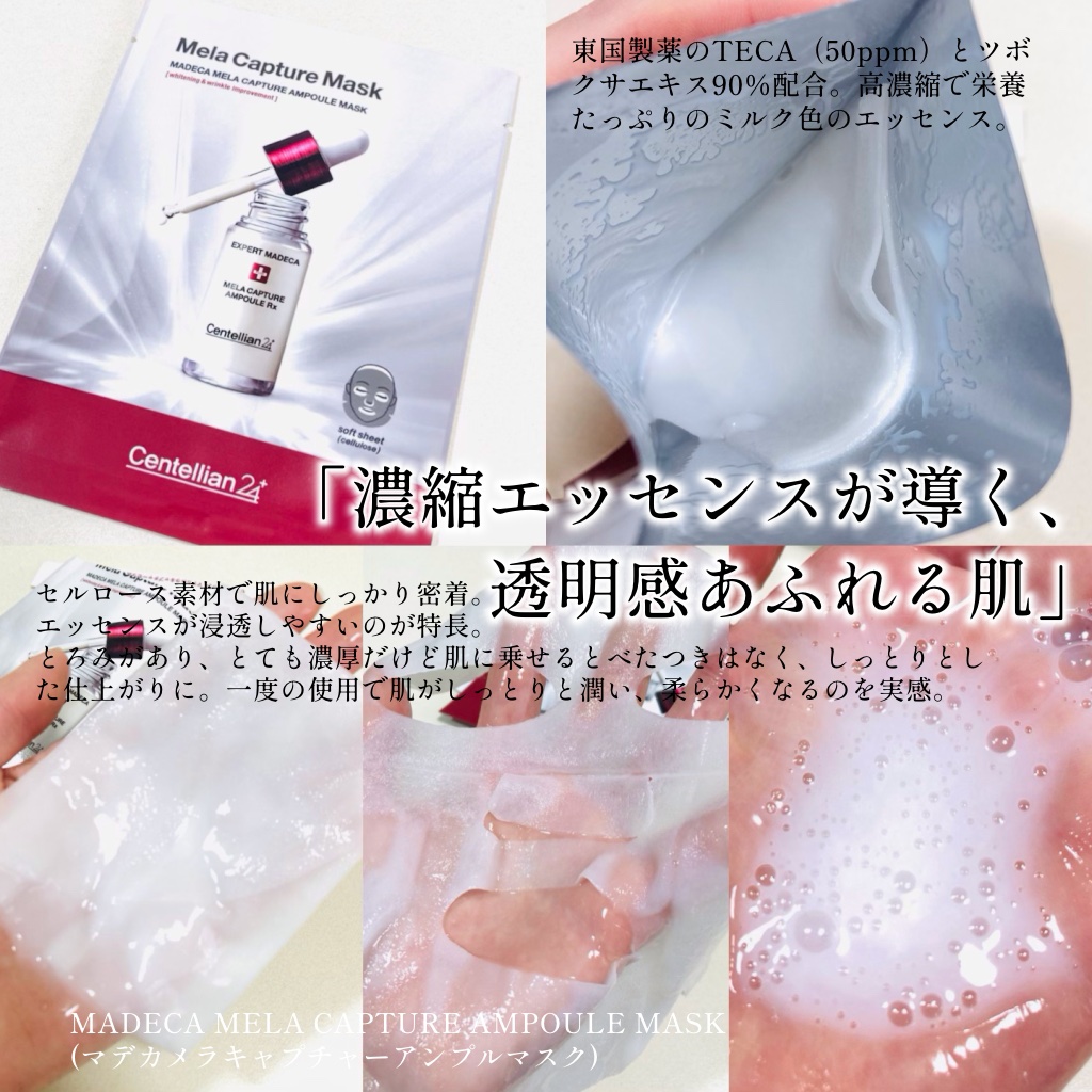 メラキャプチャーアンプルの核心成分が含まれた高濃縮エッセンス配合✨ 東国製薬の核心技術TECAとツボクサエキスを配合しています🌿 薄手なのに乳液のようなエッセンスがたっぷり含まれているシートマスクはすごくやさしい使い心地💗 こちらのマスクは特にシミや肌トーンの暗さに悩む方にオススメです!