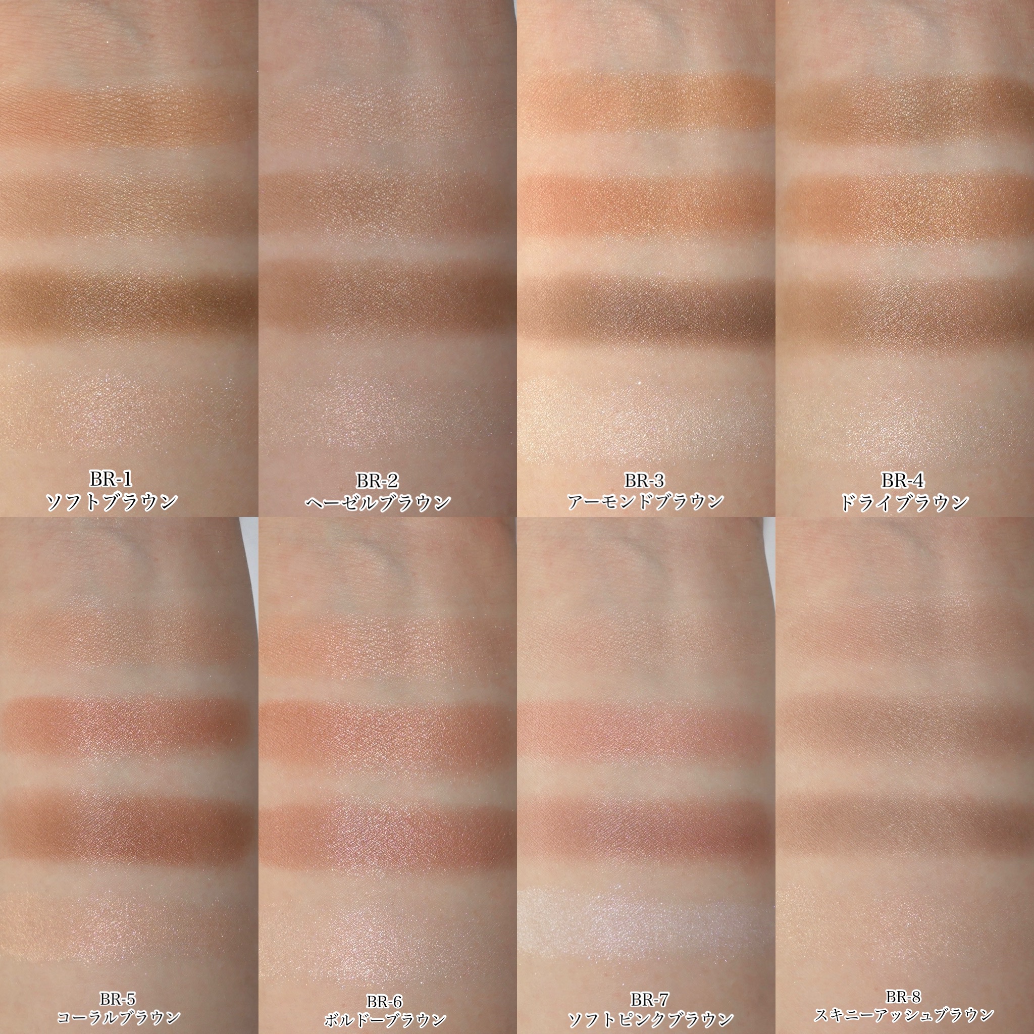 - <BR-1 ソフトブラウン> タルク、合成フルオロフロゴパイト、マイカ、トリ(カプリル酸/カプリン酸)グリセリル、ジフェニルシロキシフェニルトリメチコン、テトライソステアリン酸ペンタエリスリチル、水添ポリイソブテン、ミリスチン酸Mg、ジメチコン、ステアロイルグルタミン酸2Na、ミリスチン酸亜鉛、イソステアリン酸ソルビタン、水酸化Al、エチルパラベン、メチルパラベン、デヒドロ酢酸Na、(+/-)アルミナ、グンジョウ、酸化チタン、酸化鉄、酸化スズ、ホウケイ酸(Ca/Al)、赤202、赤226 <BR-2 ヘーゼルブラウン> タルク、合成フルオロフロゴパイト、マイカ、トリ(カプリル酸/カプリン酸)グリセリル、ジフェニルシロキシフェニルトリメチコン、テトライソステアリン酸ペンタエリスリチル、水添ポリイソブテン、ミリスチン酸Mg、ジメチコン、ステアロイルグルタミン酸2Na、ミリスチン酸亜鉛、イソステアリン酸ソルビタン、水酸化Al、エチルパラベン、メチルパラベン、デヒドロ酢酸Na、(+/-)アルミナ、グンジョウ、酸化チタン、酸化鉄、酸化スズ、ホウケイ酸(Ca/Al)、赤202、赤226 <BR-3 アーモンドブラウン> タルク、合成フルオロフロゴパイト、マイカ、トリ(カプリル酸/カプリン酸)グリセリル、ジフェニルシロキシフェニルトリメチコン、テトライソステアリン酸ペンタエリスリチル、水添ポリイソブテン、ミリスチン酸Mg、ジメチコン、ステアロイルグルタミン酸2Na、ミリスチン酸亜鉛、イソステアリン酸ソルビタン、水酸化Al、エチルパラベン、メチルパラベン、デヒドロ酢酸Na、(+/-)アルミナ、グンジョウ、酸化チタン、酸化鉄、酸化スズ、ホウケイ酸(Ca/Al)、赤202、赤226 <BR-4 ドライブラウン> タルク、合成フルオロフロゴパイト、マイカ、トリ(カプリル酸/カプリン酸)グリセリル、ジフェニルシロキシフェニルトリメチコン、テトライソステアリン酸ペンタエリスリチル、水添ポリイソブテン、ミリスチン酸Mg、ジメチコン、ステアロイルグルタミン酸2Na、ミリスチン酸亜鉛、イソステアリン酸ソルビタン、水酸化Al、エチルパラベン、メチルパラベン、デヒドロ酢酸Na、(+/-)アルミナ、グンジョウ、酸化チタン、酸化鉄、酸化スズ、ホウケイ酸(Ca/Al)、赤202、赤226 <BR-5 コーラルブラウン> タルク、合成フルオロフロゴパイト、マイカ、トリ(カプリル酸/カプリン酸)グリセリル、ジフェニルシロキシフェニルトリメチコン、テトライソステアリン酸ペンタエリスリチル、水添ポリイソブテン、ミリスチン酸Mg、ジメチコン、ステアロイルグルタミン酸2Na、ミリスチン酸亜鉛、イソステアリン酸ソルビタン、水酸化Al、エチルパラベン、メチルパラベン、デヒドロ酢酸Na、(+/-)アルミナ、グンジョウ、酸化チタン、酸化鉄、酸化スズ、ホウケイ酸(Ca/Al)、赤202、赤226 <BR-6 ボルドーブラウン> タルク、合成フルオロフロゴパイト、マイカ、トリ(カプリル酸/カプリン酸)グリセリル、ジフェニルシロキシフェニルトリメチコン、テトライソステアリン酸ペンタエリスリチル、水添ポリイソブテン、ミリスチン酸Mg、ジメチコン、ステアロイルグルタミン酸2Na、ミリスチン酸亜鉛、イソステアリン酸ソルビタン、水酸化Al、エチルパラベン、メチルパラベン、デヒドロ酢酸Na、(+/-)アルミナ、グンジョウ、酸化チタン、酸化鉄、酸化スズ、ホウケイ酸(Ca/Al)、赤202、赤226 <BR-7 ソフトピンクブラウン> タルク、合成フルオロフロゴパイト、マイカ、トリ(カプリル酸/カプリン酸)グリセリル、ジフェニルシロキシフェニルトリメチコン、テトライソステアリン酸ペンタエリスリチル、水添ポリイソブテン、ミリスチン酸Mg、ジメチコン、ステアロイルグルタミン酸2Na、ミリスチン酸亜鉛、イソステアリン酸ソルビタン、水酸化Al、エチルパラベン、メチルパラベン、デヒドロ酢酸Na、(+/-)アルミナ、グンジョウ、コンジョウ、シリカ、パルミチン酸、酸化チタン、酸化鉄、硫酸Ba、トリイソステアリン酸イソプロピルチタン、酸化スズ、ホウケイ酸(Ca/Al)、赤202、赤226 <BR-8 スキニーアッシュブラウン> タルク、合成フルオロフロゴパイト、マイカ、トリ(カプリル酸/カプリン酸)グリセリル、ジフェニルシロキシフェニルトリメチコン、テトライソステアリン酸ペンタエリスリチル、水添ポリイソブテン、ミリスチン酸Mg、ジメチコン、ステアロイルグルタミン酸2Na、ミリスチン酸亜鉛、イソステアリン酸ソルビタン、水酸化Al、エチルパラベン、メチルパラベン、デヒドロ酢酸Na、(+/-)アルミナ、グンジョウ、酸化チタン、酸化鉄、酸化スズ、ホウケイ酸(Ca/Al)、赤202、赤226 <EX-1 メルティング コーラルブラウン(限定)> タルク、合成フルオロフロゴパイト、マイカ、トリ(カプリル酸/カプリン酸)グリセリル、ジフェニルシロキシフェニルトリメチコン、テトライソステアリン酸ペンタエリスリチル、水添ポリイソブテン、ミリスチン酸Mg、ジメチコン、ステアロイルグルタミン酸2Na、ミリスチン酸亜鉛、イソステアリン酸ソルビタン、水酸化Al、エチルパラベン、メチル