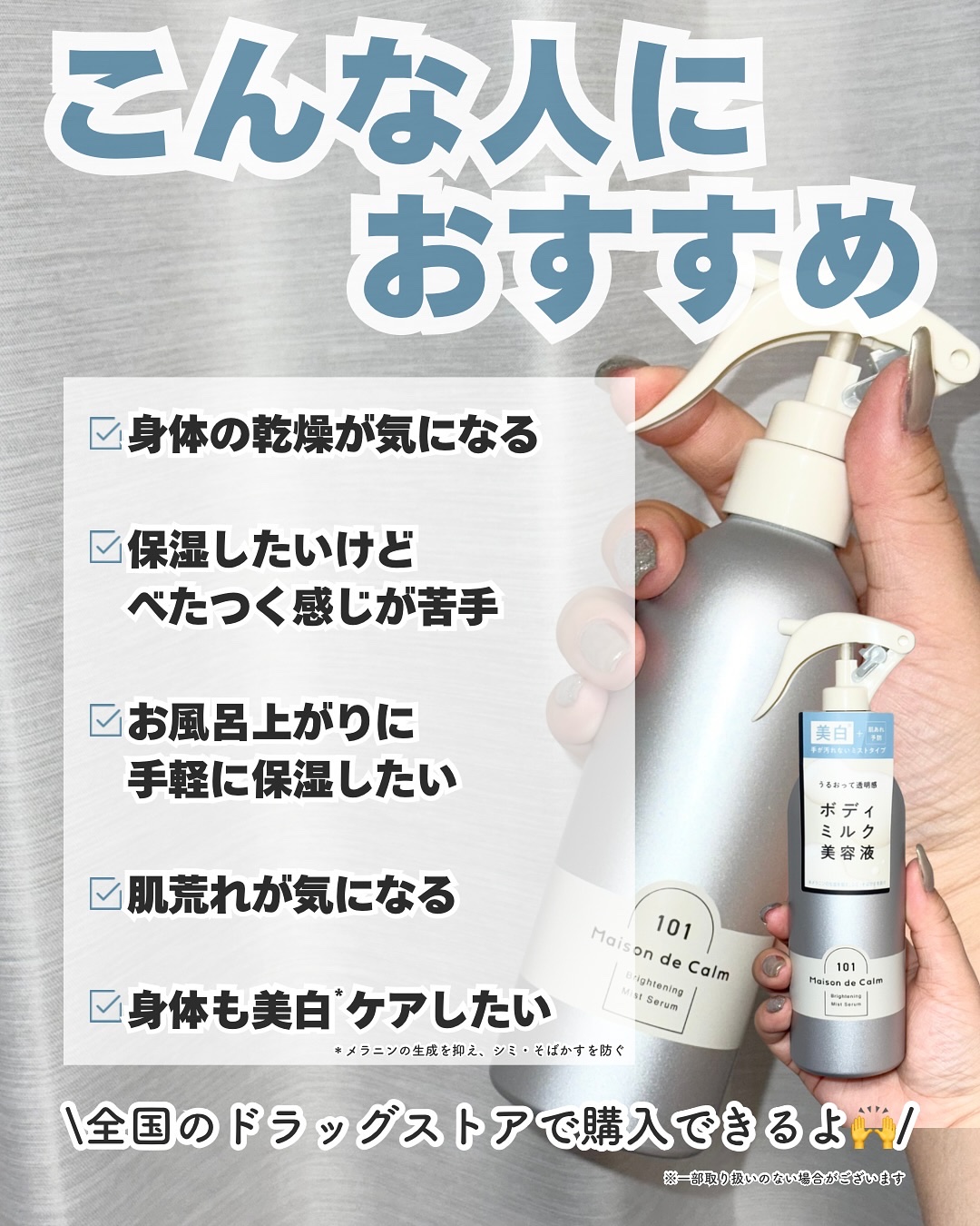 メゾンドカーム ブライトニングミストセラム<販売名:薬用美容液W7 a>【医薬部外品】片手でシュッとケアできる、ミストタイプのボディ用美白美容液🤍🫧贅沢なWの有効成分で美白+肌あれ・ニキビ予防効果🌟タオルかけにかけといてすぐにシュッとできるよ...