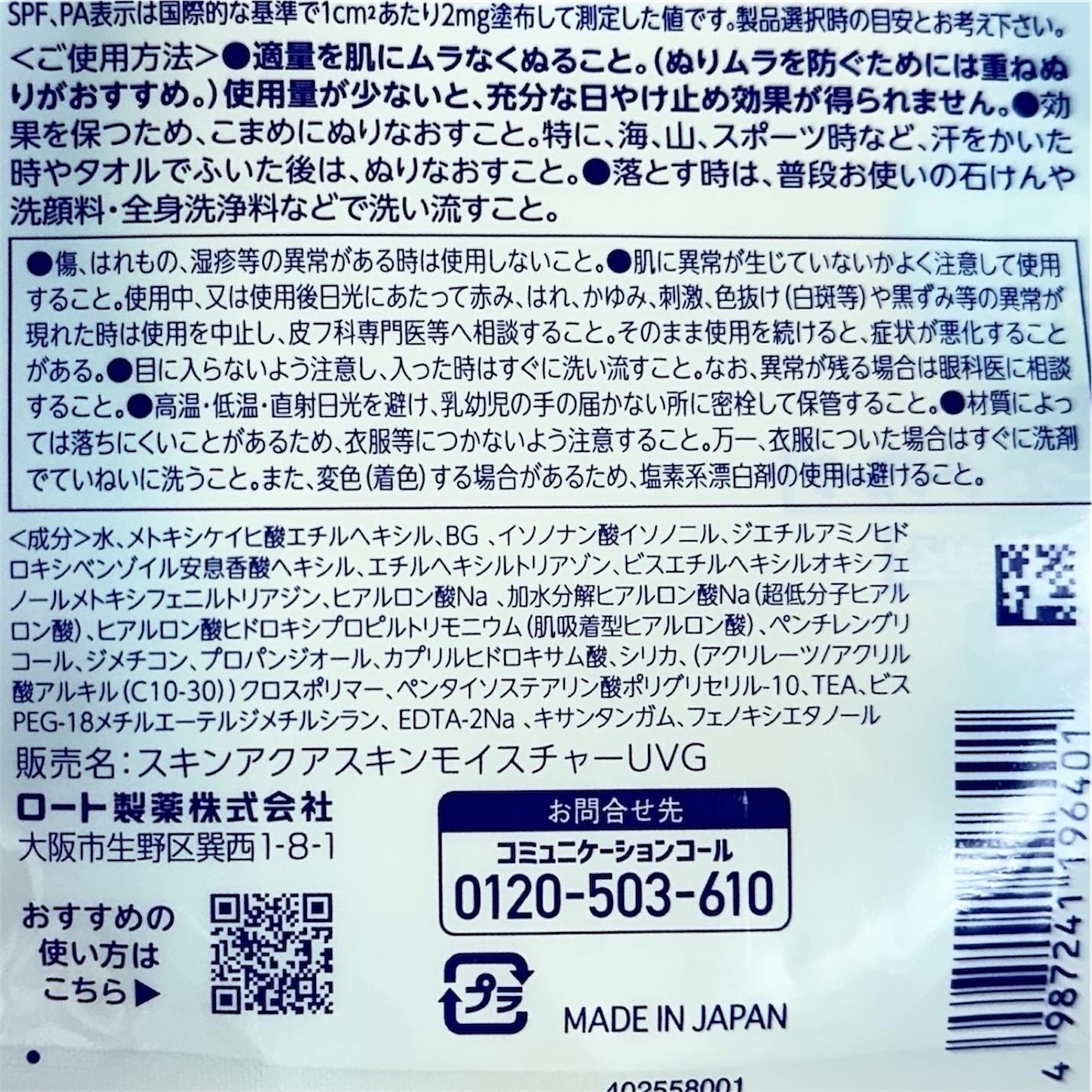 - エタノールフリーで心地よい使用感を実現。最高濃度※1の3種のヒアルロン酸※2配合。 水のようなつけ心地でうるおってもちっとした肌に。 使いやすいワンタッチキャップ。 SPF50+/PA++++/UV耐水性★★。 ※1:スキンアクアシリーズ内において ※2:うるおい成分:ヒアルロン酸Na、超低分子ヒアルロン酸(加水分解ヒアルロン酸Na)、肌吸着型ヒアルロン酸(ヒアルロン酸ヒドロキシプロピルトリモニウム)