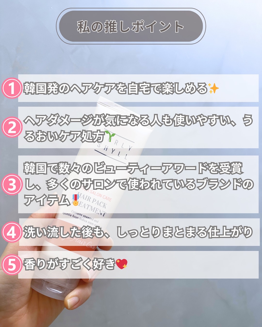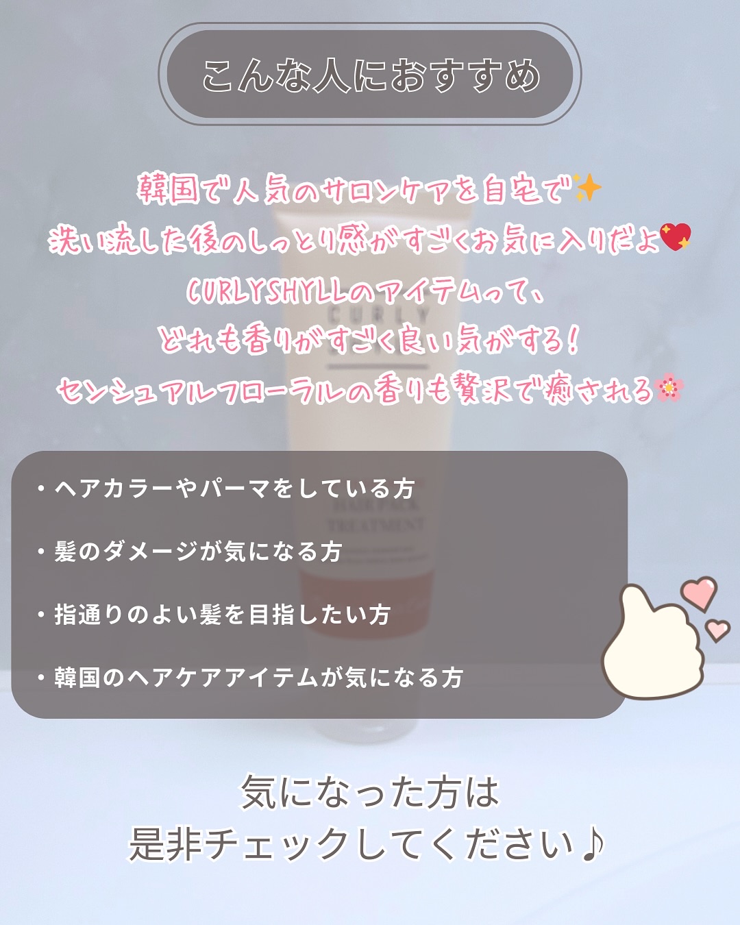 有名K-POPアイドルや俳優、有名雑誌のヘアメイクを担当するトップスタイリストたちが経験とノウハウを活かし製品開発したブランド✨curlyshyll様のアフターサロンケアヘアパックトリートメント🧴ご提供いただきました。タンパク質成分やヒアルロ...