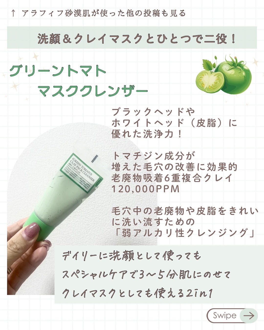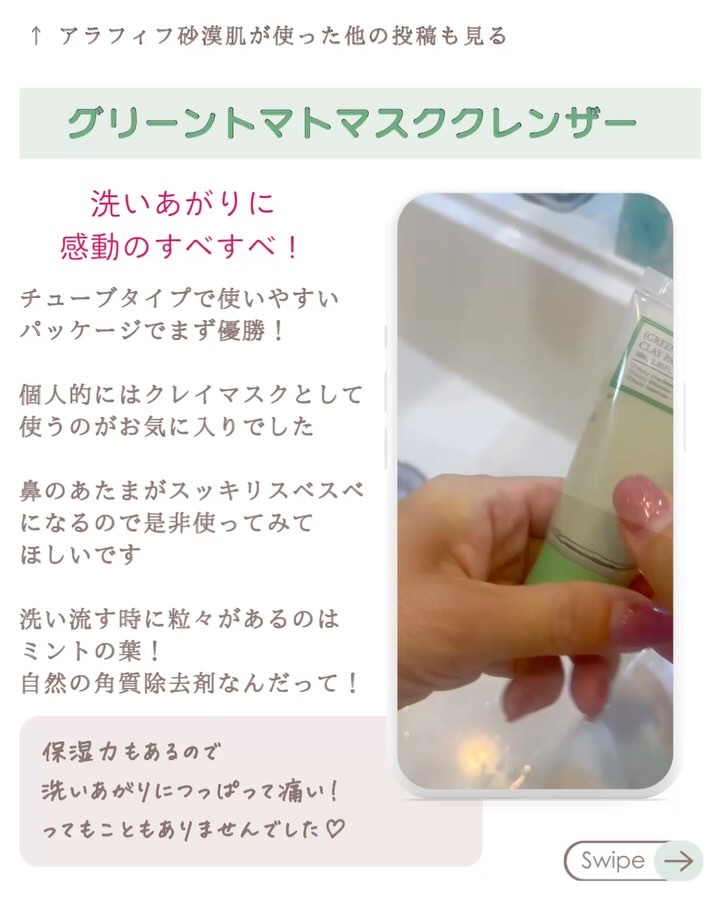 グリーントマトがスキンケアに!肌の弾力低下や毛穴の縦毛穴、横毛穴のたるみ気になってませんか??? さっぱりとしてるのにしっかり潤うジェル状クリームは重たいクリームが無理な人でも使いやすいテクスチャーで気持ち良すぎてミルフィーユのように塗っちゃいました🤣 お鼻のブラックヘッドやホワイトヘッド(皮脂)に優れた洗浄力で毛穴を改善してくれる弱アルカリ性クレンジングです💚