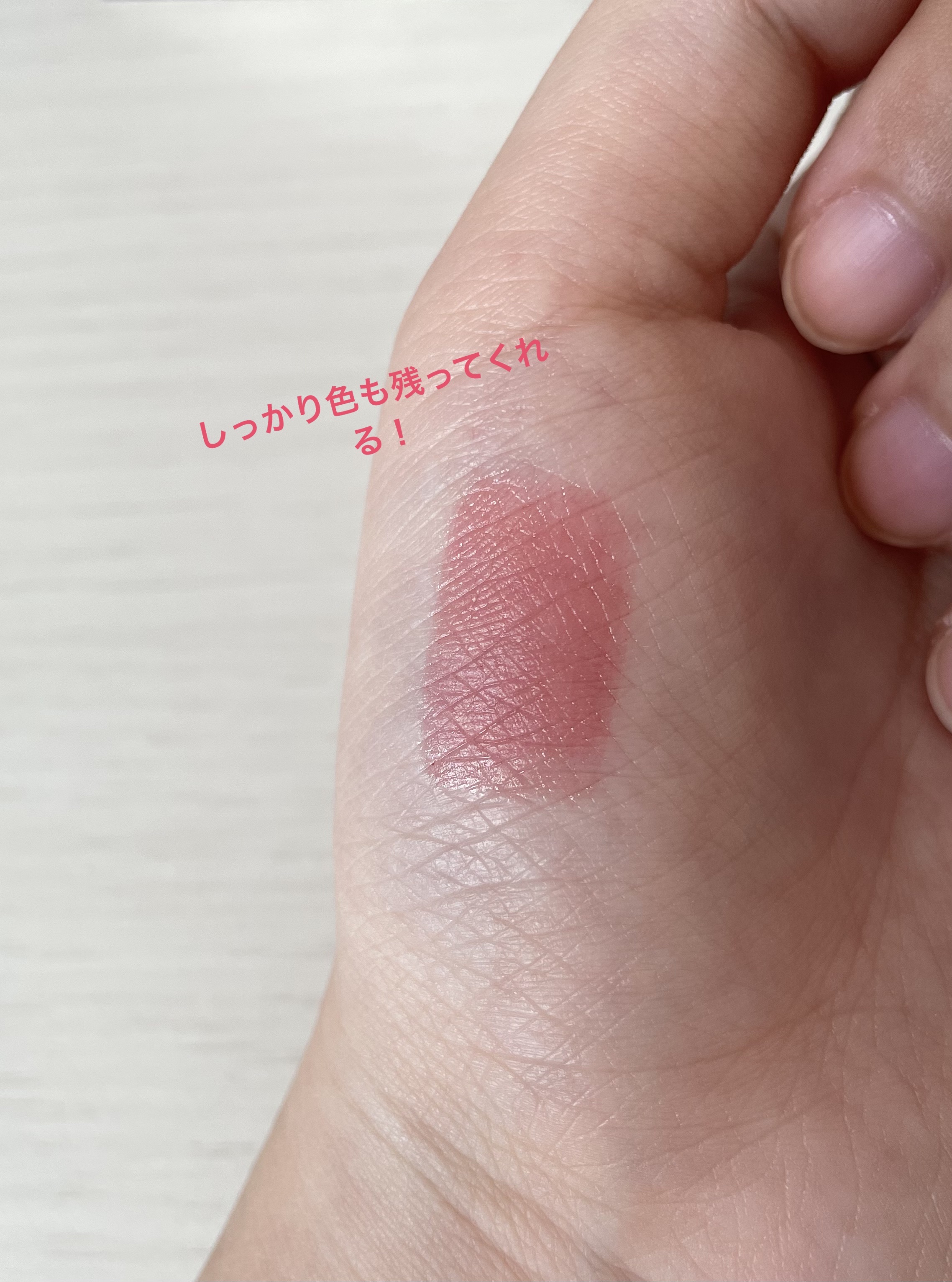 少し濃いめのピンクでかわいい! 食事をすると若干、落ちてしまいますが基本的には1日中持ってくれます! 1日中ツヤ感があって、しっとりしてる 色持ち、ツヤ感、最高です! 塗った後はぜひ、ンパンパせずに10秒待ってみてください!綺麗なツヤが出てきてくれます🫧