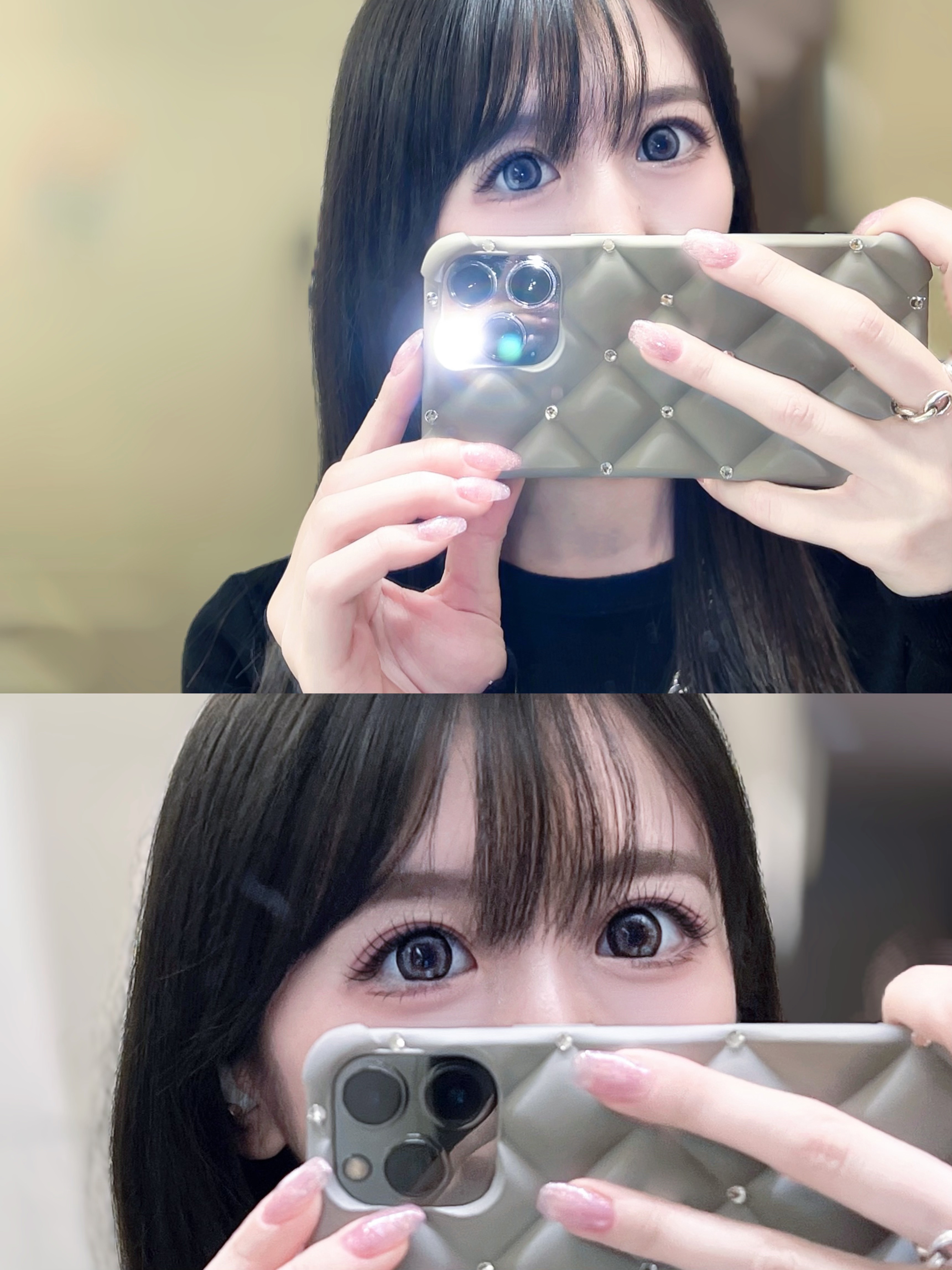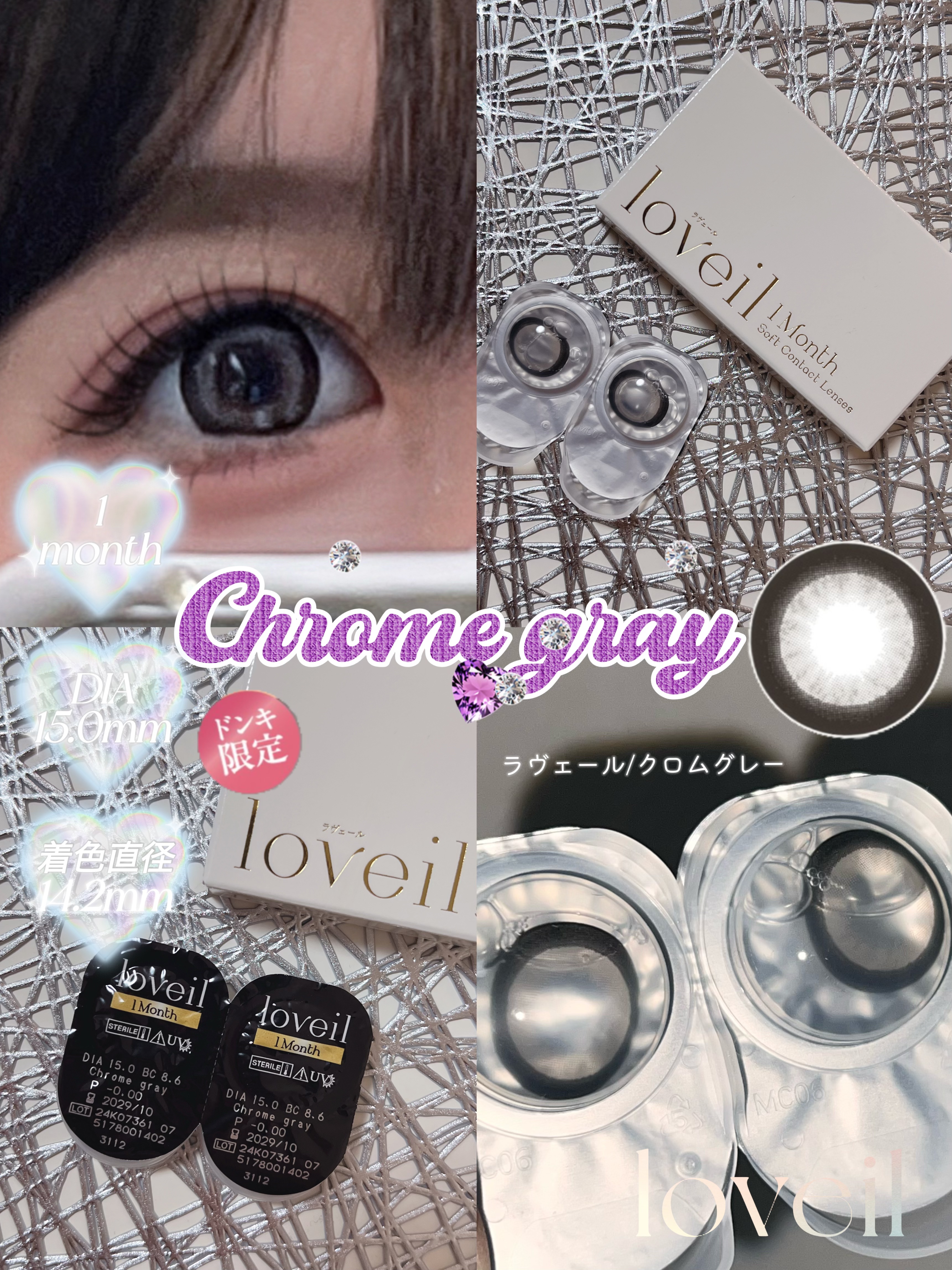 倖田來未さんプロデュースカラコン『 loveil (ラヴェール)』のマンスリーシリーズ🌥️ なんとDIAが15mm、着色直径が14.2mm😳 黒の極太フチにプラチナグレー🤍 白にも青にも寄ってないグレーがしっかり発色👏