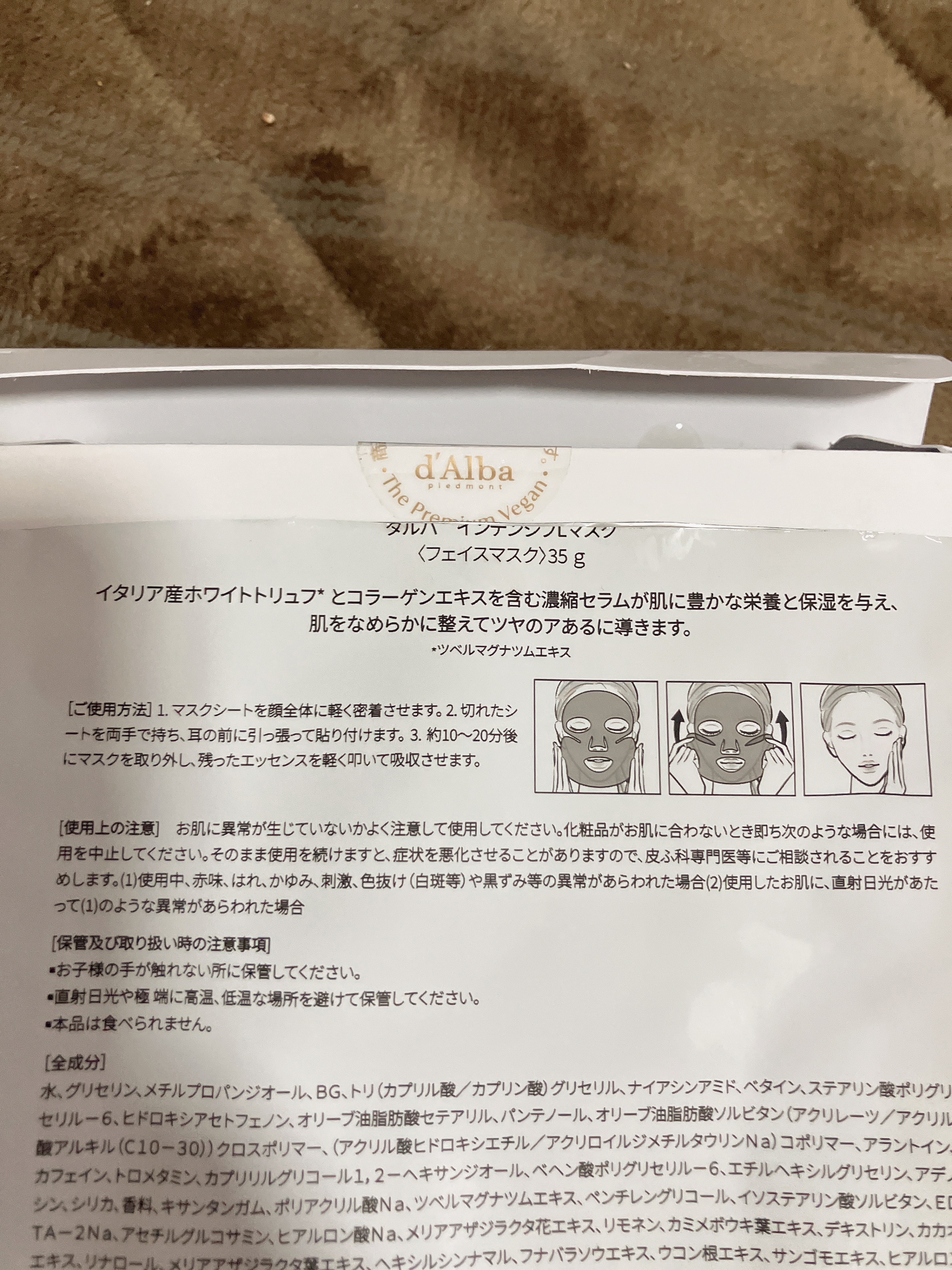 - <1枚> 水、グリセリン、メチルプロパンジオール、BG、トリ(カプリル酸/カプリン酸)グリセリル、ナイアシンアミド、ベタイン、ステアリン酸ポリグリセリル-6、ヒドロキシアセトフェノン、オリーブ油脂肪酸セテアリル、パンテノール、オリーブ油脂肪酸ソルビタン、(アクリレーツ/アクリル酸アルキル(C10-30))クロスポリマー、(アクリル酸ヒドロキシエチル/アクリロイルジメチルタウリンNa)コポリマー、アラントイン、カフェイン、トロメタミン、カプリリルグリコール、1,2-ヘキサンジオール、ベヘン酸ポリグリセリル-6、エチルヘキシルグリセリン、アデノシン、シリカ、香料、キサンタンガム、ポリアクリル酸Na、ツベルマグナツムエキス、ペンチレングリコール、イソステアリン酸ソルビタン、EDTA-2Na、アセチルグルコサミン、ヒアルロン酸Na、メリアアザジラクタ花エキス、リモネン、カミメボウキ葉エキス、デキストリン、カカオエキス、リナロール、メリアアザジラクタ葉エキス、ヘキシルシンナマル、フナバラソウエキス、ウコン根エキス、サンゴモエキス、ヒアルロン酸クロスポリマーNa、タチアオイ花エキス、グルコース、マンノース、ツバキ種子油、ヒマワリ種子油、月見草油、オリーブ果実油、アボカド油、ダイズ油、マカデミア種子油、コラーゲンエキス、セラミドNP、水添ポリイソブテン、異性化糖、キシリチルグルコシド、無水キシリトール、トコフェロール、キシリトール、ヒポファエラムノイデス果実油、クエン酸、クエン酸Na、ツボクサエキス、ツボクサ葉エキス、ツボクサ根エキス、ヒアルロン酸ヒドロキシプロピルトリモニウム、ハナスゲ根エキス、ニゲラサチバ種子油、加水分解ヒアルロン酸、アセチルヒアルロン酸Na、マデカッソシド、アシアチコシド、アシアチン酸、ヒアルロン酸、マデカシン酸、加水分解ヒアルロン酸Na、ヒアルロン酸K <4枚> 水、グリセリン、メチルプロパンジオール、BG、トリ(カプリル酸/カプリン酸)グリセリル、ナイアシンアミド、ベタイン、ステアリン酸ポリグリセリル-6、ヒドロキシアセトフェノン、オリーブ油脂肪酸セテアリル、パンテノール、オリーブ油脂肪酸ソルビタン、(アクリレーツ/アクリル酸アルキル(C10-30))クロスポリマー、(アクリル酸ヒドロキシエチル/アクリロイルジメチルタウリンNa)コポリマー、アラントイン、カフェイン、トロメタミン、カプリリルグリコール、1,2-ヘキサンジオール、ベヘン酸ポリグリセリル-6、エチルヘキシルグリセリン、アデノシン、シリカ、香料、キサンタンガム、ポリアクリル酸Na、ツベルマグナツムエキス、ペンチレングリコール、イソステアリン酸ソルビタン、EDTA-2Na、アセチルグルコサミン、ヒアルロン酸Na、メリアアザジラクタ花エキス、リモネン、カミメボウキ葉エキス、デキストリン、カカオエキス、リナロール、メリアアザジラクタ葉エキス、ヘキシルシンナマル、フナバラソウエキス、ウコン根エキス、サンゴモエキス、ヒアルロン酸クロスポリマーNa、タチアオイ花エキス、グルコース、マンノース、ツバキ種子油、ヒマワリ種子油、月見草油、オリーブ果実油、アボカド油、ダイズ油、マカデミア種子油、コラーゲンエキス、セラミドNP、水添ポリイソブテン、異性化糖、キシリチルグルコシド、無水キシリトール、トコフェロール、キシリトール、ヒポファエラムノイデス果実油、クエン酸、クエン酸Na、ツボクサエキス、ツボクサ葉エキス、ツボクサ根エキス、ヒアルロン酸ヒドロキシプロピルトリモニウム、ハナスゲ根エキス、ニゲラサチバ種子油、加水分解ヒアルロン酸、アセチルヒアルロン酸Na、マデカッソシド、アシアチコシド、アシアチン酸、ヒアルロン酸、マデカシン酸、加水分解ヒアルロン酸Na、ヒアルロン酸K