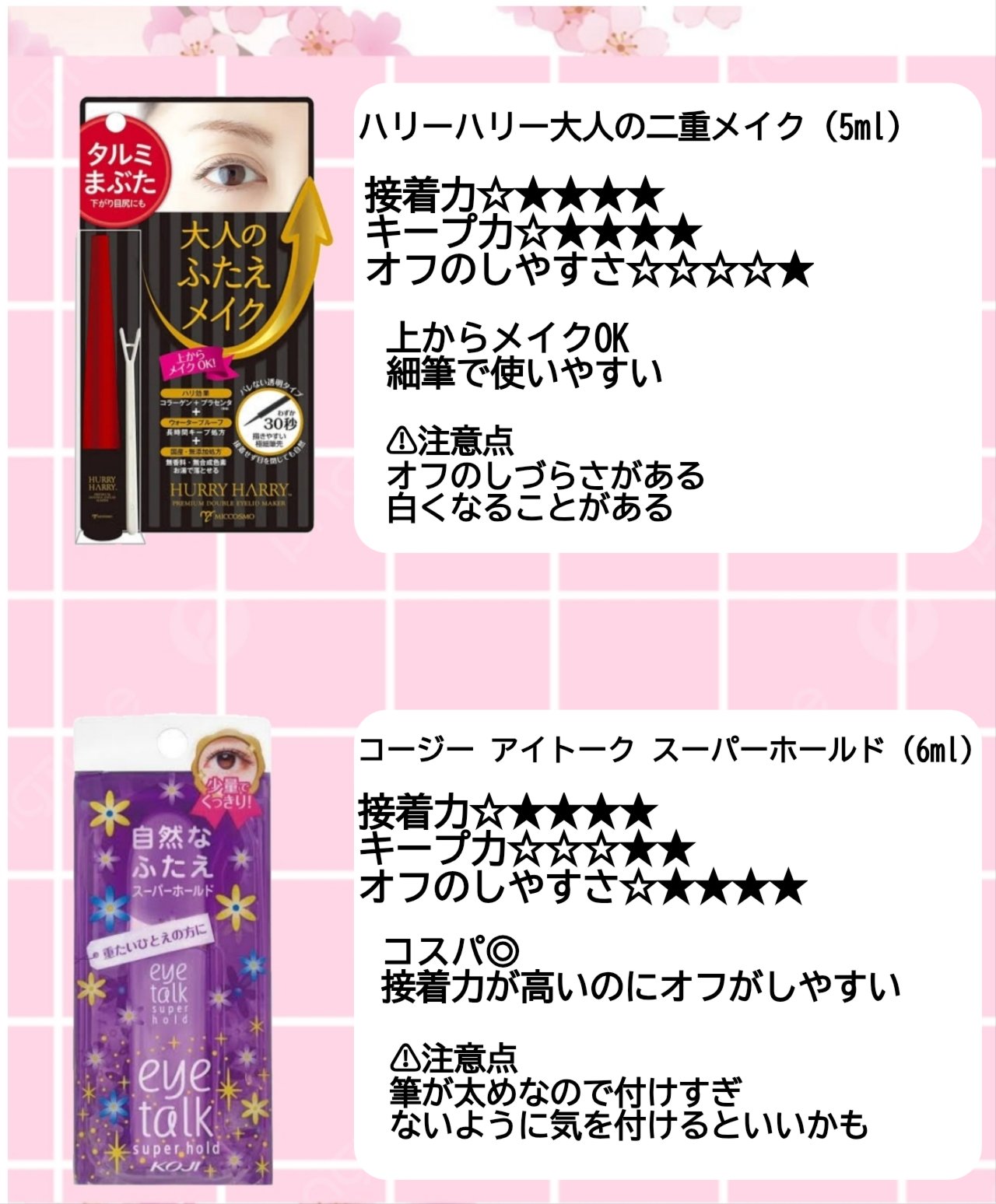 今回紹介させて頂いた商品①リニューアル品ABふたえ接着スーパーハード 購入時値段1050円 接着力重視なら①、⑤ キープ力重視なら②、③ オフのしやすさ重視なら④、⑥ 感じ方には個人差があるのであくまで参考程度に