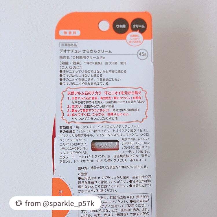 - \11年間ず~っと売上No.1*直ヌリ制汗デオドラントブランド/ デオナチュレシリーズ内最大量の有効成分「焼ミョウバン」を配合 ″ワキガにも効く!″「薬用デオナチュレ さらさらクリーム」 直ヌリクリームタイプ・無香料 ◆◆もしかしたらワキガかも⁈ ワキの汗・ニオイに悩む方に◆◆ ・ニオイの気になるところに、指でしっかりぬれる密着クリームタイプ ・クリームタイプだから、ワキ、首、背中まで広範囲にぬれる ◆◆ユーザーから選ばれる理由◆◆ 1.天然アルム石に着目。有効成分「焼ミョウバン」を配合し、汗・ニオイを元から防ぐ! 2.広範囲に、“直ヌリ”で有効成分がしっかり密着し、朝ぬって夜まで続いちゃう! 3.クリームなのに、サラサラ!ベタつかず・白残りしにくい ==注意== ●顔・粘膜を避け、除脱毛直後や肌に異常があるときは使用しないでください。●肌に異常が生じていないかよく注意してご使用ください。また、お肌に合わないとき、使用中に赤み、はれ、かゆみ、刺激、色抜け(白班等)や黒ずみ等の異常があらわれたときは、使用を中止し、皮フ科専門医などにご相談ください。●使用後はキャップをしっかり閉め、直射日光や高温多湿を避けて保管してください。●乳幼児の手の届かないところに置いてください。●衣類などにつかないようご注意ください。 販売名:DN薬用クリームFe *インテージSRI+直ヌリ制汗剤市場(形状:ロールオン・スティック・クリーム・ジェル・パウダー) 2013年5月~2024年4月 デオナチュレシリーズ 累計販売金額