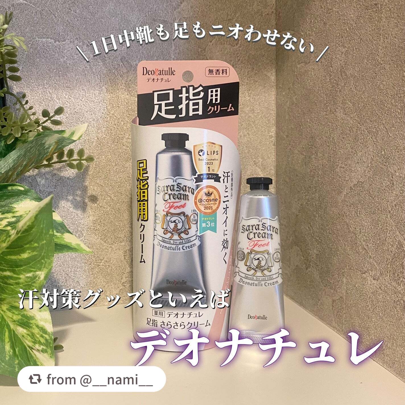 - \11年間ず~っと売上No.1*直ヌリ制汗デオドラントブランド/ 『防臭力のデオナチュレ』シリーズから、足特有のムレ・ニオイを防ぐ足用処方「薬用デオナチュレ足指さらさらクリーム」 ◆◆靴、脱ぐの⁈とドキッとすること、ありませんか?◆◆ 足は1日コップ約1杯分の汗をかき、ムレて、ニオイやすい だから、デオナチュレの足用でケア! ◆◆ユーザーから選ばれる理由◆◆ 1.天然アルム石に着目。有効成分「焼ミョウバン」を配合し、汗・ニオイを元から防ぐ! 足汗吸収さらさらパウダー**やティーツリーハーブ・ローズマリーエキス***を配合 2.ニオイの発生源に“直ヌリ”で、朝ぬって夜まで続いちゃう! 3.クリームなのに、ベタつかず・白残りしにくい ==注意== ●顔・粘膜を避け、除脱毛直後や肌に異常があるときは使用しないでください。●肌に異常が生じていないかよく注意してご使用ください。また、お肌に合わないとき、使用中に赤み、はれ、かゆみ、刺激、色抜け(白班等)や黒ずみ等の異常があらわれたときは、使用を中止し、皮フ科専門医などにご相談ください。●使用後はキャップをしっかり閉め、直射日光や高温多湿を避けて保管してください。●乳幼児の手の届かないところに置いてください。●床、靴、衣類などにつかないようご注意ください。 販売名:DN薬用フットクリームFc *インテージSRI+直ヌリ制汗剤市場(形状:ロールオン・スティック・クリーム・ジェル・パウダー) 2013年5月~2024年4月 デオナチュレシリーズ 累計販売金額 **基剤:無水ケイ酸 ***保湿成分