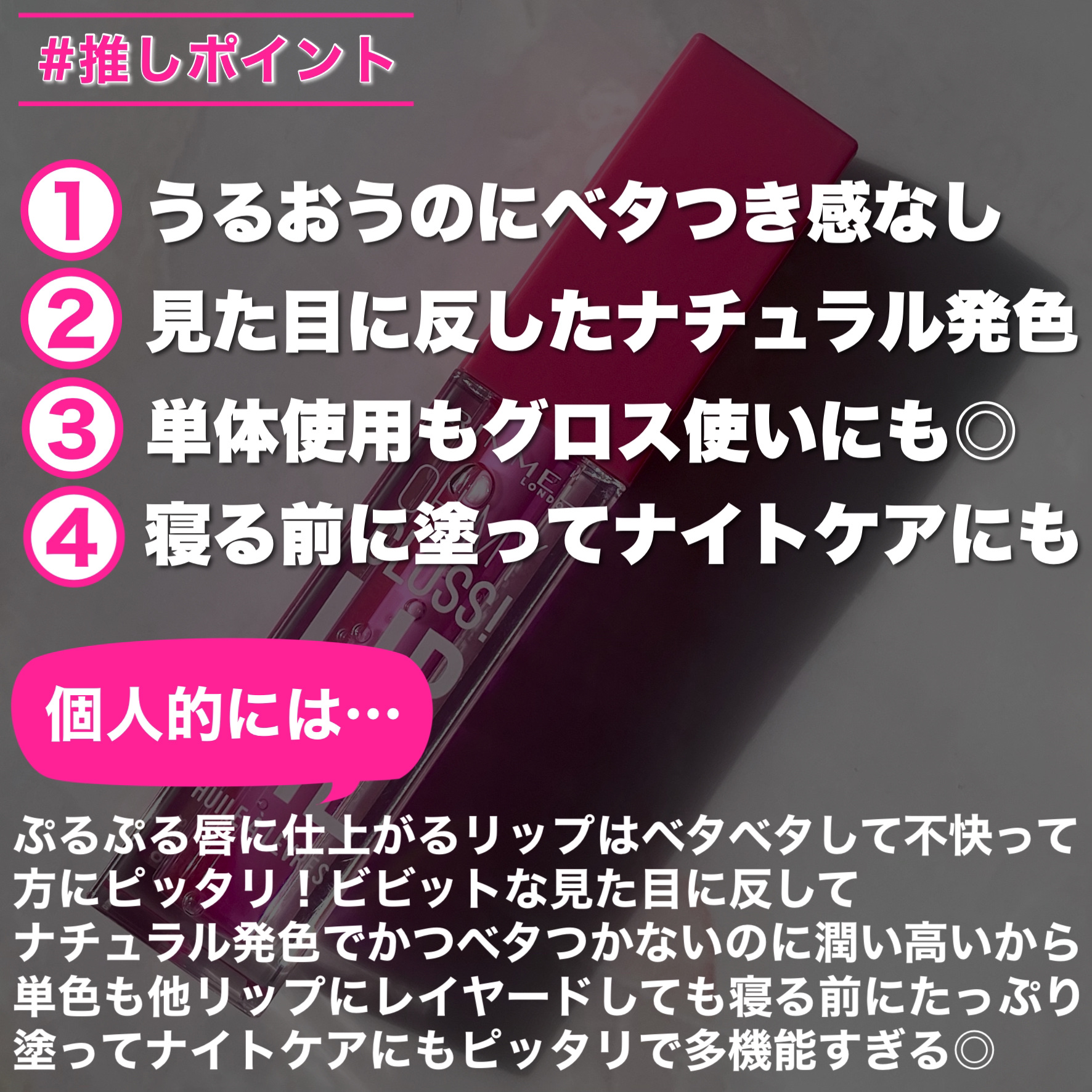 | 口紅・グロス・リップライナーランキング第51位 | もったりしてるけどベタつかないようなテクスチャーです!大きめのアプリケーターも使いやすかったです! | 詳細を見る | |