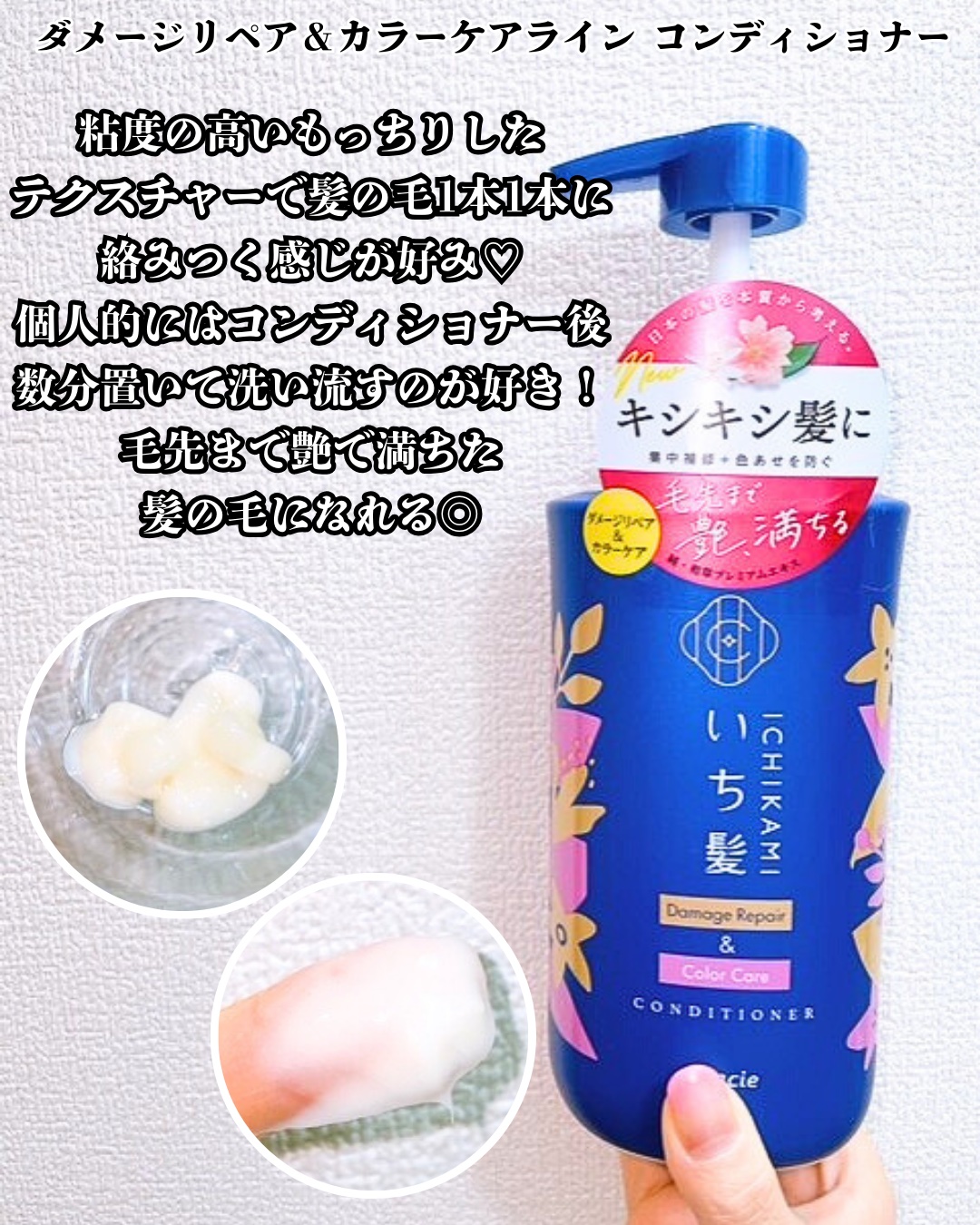 いち髪ダメージリペア&カラーケアライン ヘアカラーなどダメージによるキシキシ髪でお悩みの方にオススメ♡ 髪ダメージを集中補修して毛先まで艶、満ちる✨ 洗練された檸檬花と清らな桜🌸三分咲きの香り サラッとしたテクスチャー 泡立ちも良い◎ 翌朝の髪はかなり落ち着いてます✨ ヘアブラシするだけでかなり整いますね😊