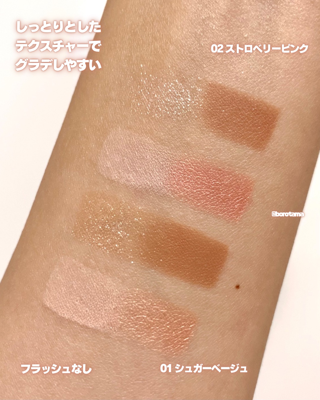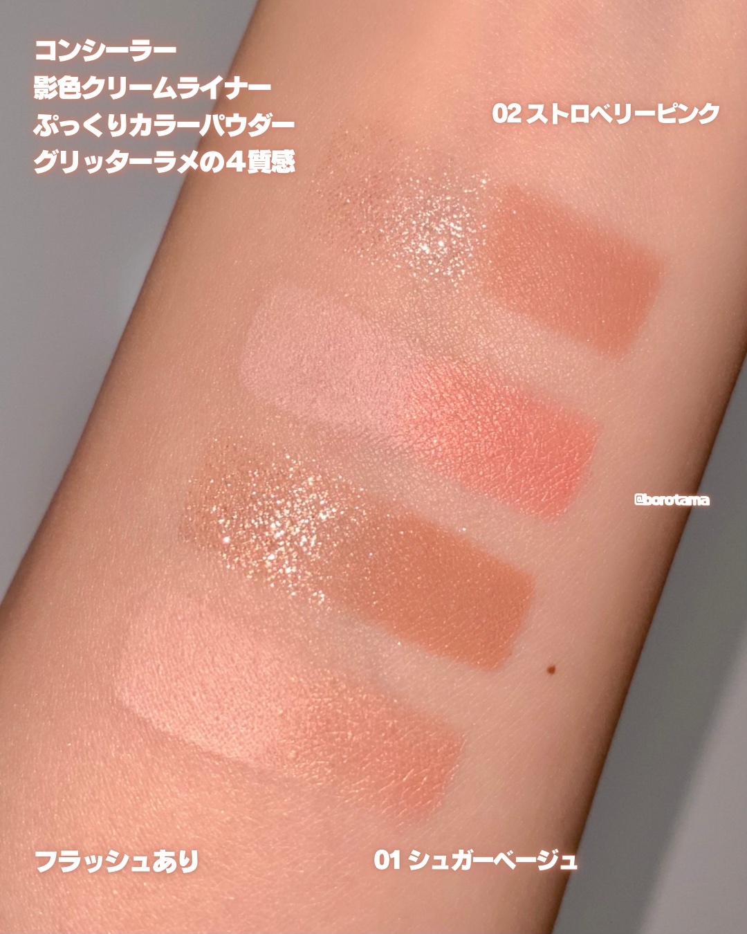- <01 シュガーベージュ> マイカ、タルク、ジメチコン、酸化鉄、酸化チタン、フェニルトリメチコン、イソノナン酸イソノニル、合成フルオロフロゴパイト、シリカ、テトライソステアリン酸ペンタエリスリチル、トリ(カプリル酸/カプリン酸)グリセリル、パルミチン酸エチルヘキシル、ステアリン酸Mg、ポリエチレン、マイクロクリスタリンワックス、リンゴ酸ジイソステアリル、イソステアリン酸ソルビタン、(ジメチコン/ビニルジメチコン)クロスポリマー、カプリリルグリコール、トリイソステアリン酸ポリグリセリル-2、水添ポリイソブテン、酢酸トコフェロール、アルミナ、ホウケイ酸(Ca/Al)、トリエトキシカプリリルシラン、(ビニルジメチコン/メチコンシルセスキオキサン)クロスポリマー、酸化スズ <02 ストロベリーピンク> タルク、マイカ、ジメチコン、水添ポリイソブテン、合成フルオロフロゴパイト、酸化チタン、テトライソステアリン酸ペンタエリスリチル、シリカ、パルミチン酸エチルヘキシル、イソノナン酸イソノニル、トリ(カプリル酸/カプリン酸)グリセリル、カオリン、トリイソステアリン酸ポリグリセリル-2、酸化鉄、フェニルトリメチコン、マイクロクリスタリンワックス、(ジメチコン/ビニルジメチコン)クロスポリマー、カプリリルグリコール、ステアリン酸Mg、イソステアリン酸ソルビタン、ポリエチレン、酢酸トコフェロール、アルミナ、ホウケイ酸(Ca/Al)、トリエトキシカプリリルシラン、(ビニルジメチコン/メチコンシルセスキオキサン)クロスポリマー、黄4、グンジョウ、酸化スズ、赤202 <03 スイートラベンダー > マイカ、タルク、ジメチコン、酸化チタン、水添ポリイソブテン、合成フルオロフロゴパイト、シリカ、テトライソステアリン酸ペンタエリスリチル、イソノナン酸イソノニル、酸化鉄、パルミチン酸エチルヘキシル、トリ(カプリル酸/カプリン酸)グリセリル、ステアリン酸Mg、ポリエチレン、フェニルトリメチコン、(ジメチコン/ビニルジメチコン)クロスポリマー、マイクロクリスタリンワックス、グンジョウ、カプリリルグリコール、イソステアリン酸ソルビタン、トリエトキシカプリリルシラン、ホウケイ酸(Ca/Al)、酢酸トコフェロール、赤201、(ビニルジメチコン/メチコンシルセスキオキサン)クロスポリマー、酸化スズ