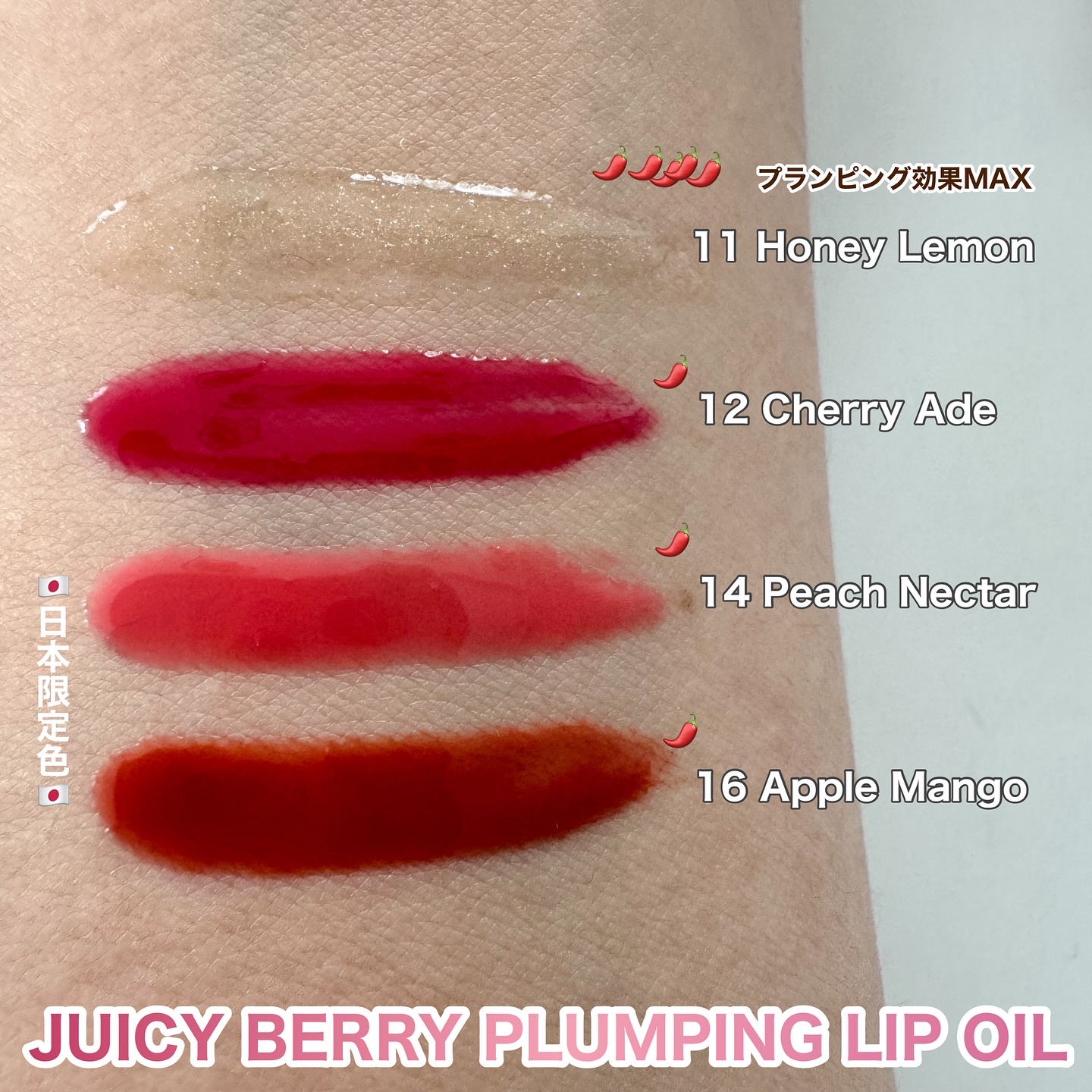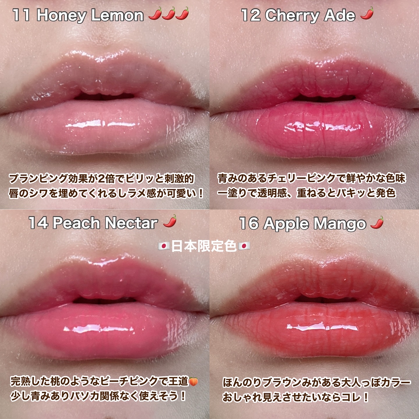 ぷっくり艶々のリップになれて可愛い🫶🏻 フルーツドリンクのような鮮やかで華やかなカラーが揃っています🥤 推しは14桃カラーが可愛いすぎる🍑 落ちないリップではないからティントをベースに塗ってから重ねて使うのがお気に入り ぷっくりちゅるちゅるなタンフルリップになれちゃう🫧 保湿力もばっちり◎