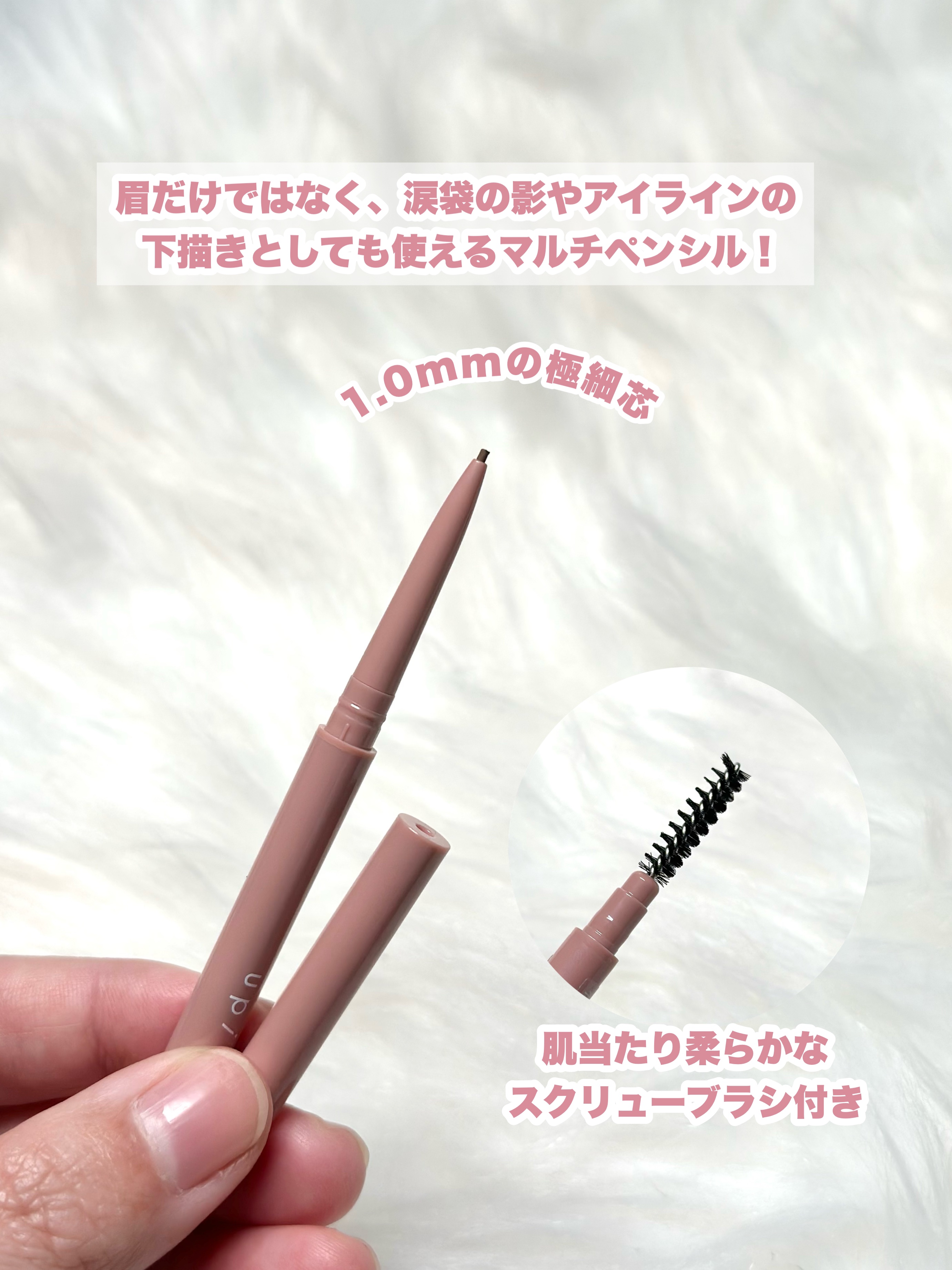 フィルスウィートチークには既存色の01 チェリーブロッサムがあり、今回新たに02 ストロベリーティアーズが追加されました🍓✨ キラキラの細かいパールが上品に輝くチーク☺️ アイ&ブロウマルチペンシルはマルチと商品名に入っている通り、眉はもちろん涙袋の影だったりアイラインの下書きとしても使う事ができる便利なペンシルです😍 Wエンド型になっていて極細ペンシルとスクリューブラシがついています★ ペンシルは本当に細いので、眉毛1本1本を描ける😆✨