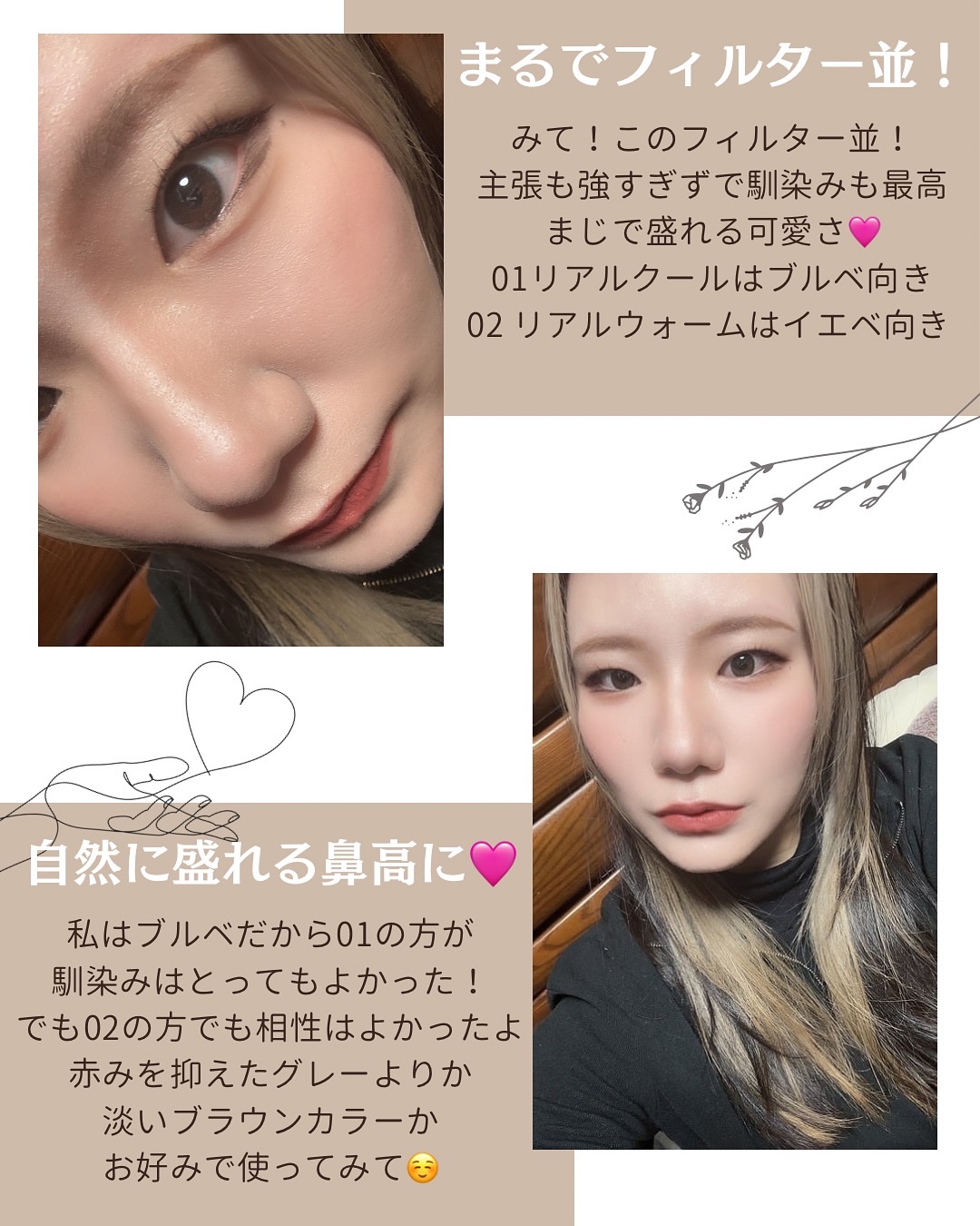 - 簡単ひと塗りで、理想のフェイスラインへ 粉っぽさを感じさせないテクスチャーで自然な影を演出し、ベタつかず快適な使い心地のコントゥアペン。 保湿成分配合で乾燥も防ぎ、仕上がりはパウダリーでなめらか。 細い斜めカットのペン先が小回り抜群で、初心者でも使いやすく、細かい部分や繊細なラインも自由自在に描けます。 さらに、付属のミニパフを使えば、ぼかしも簡単に仕上がります。 これ1本でプロのような立体感を手軽に手に入れられる優秀アイテムです。 01 リアルクール グレーっぽいカラーがブルベさん向きで、肌になじみやすく自然な立体感を演出。 02 リアルウォーム 肌なじみのよい淡く柔らかいブラウンカラーでイエベさんにぴったりのカラーです。