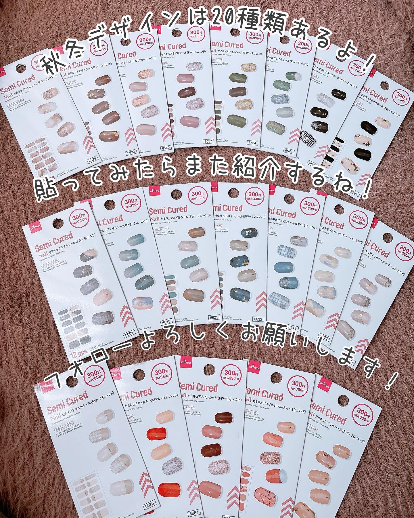 ダイソーは毎年人気の紗々ネイル! 今年はリボンのデザインがお気に入り!貼ってみるのが楽しみです✨ セリアはチョコ以外にもあって、ホワイトデーにも良さそうです! 明るくてかわいらしい雰囲気でした! ダイソーの硬化タイプのブラウン系もいい感じ! 剥がれにくいのでおすすめです✨